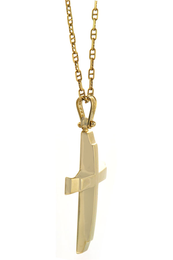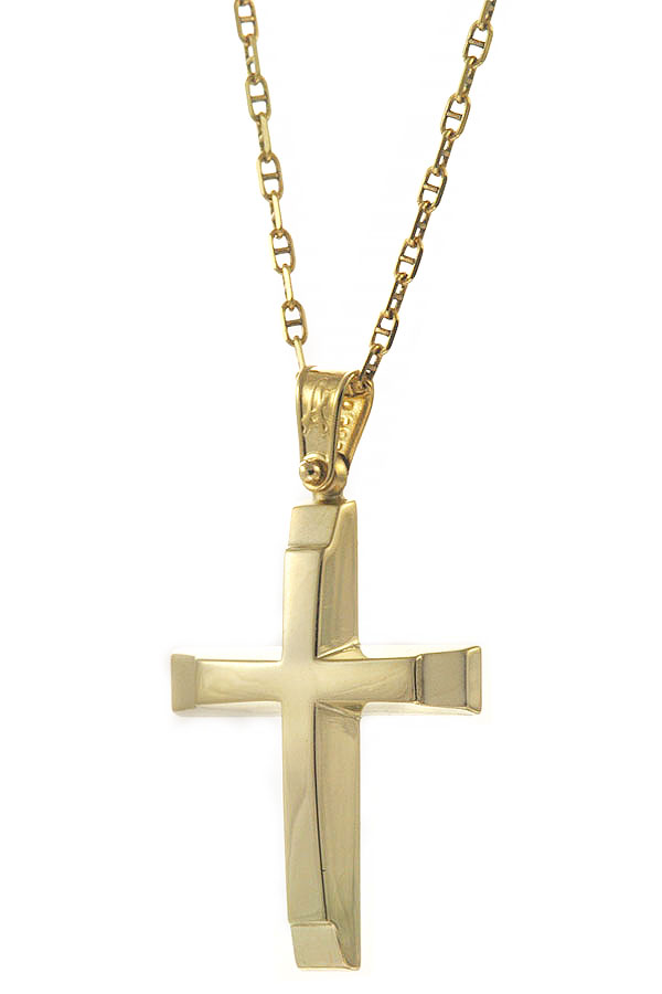 Εντυπωσιακός χρυσός σταυρός 14 καράτια με λουστρέ επιφάνεια και κομψές πλαϊνές λεπτομέρειες. Ένα κόσμημα με διαχρονικό χαρακτήρα που ξεχωρίζει για την ποιότητα και το φίνο φινίρισμά του.