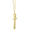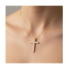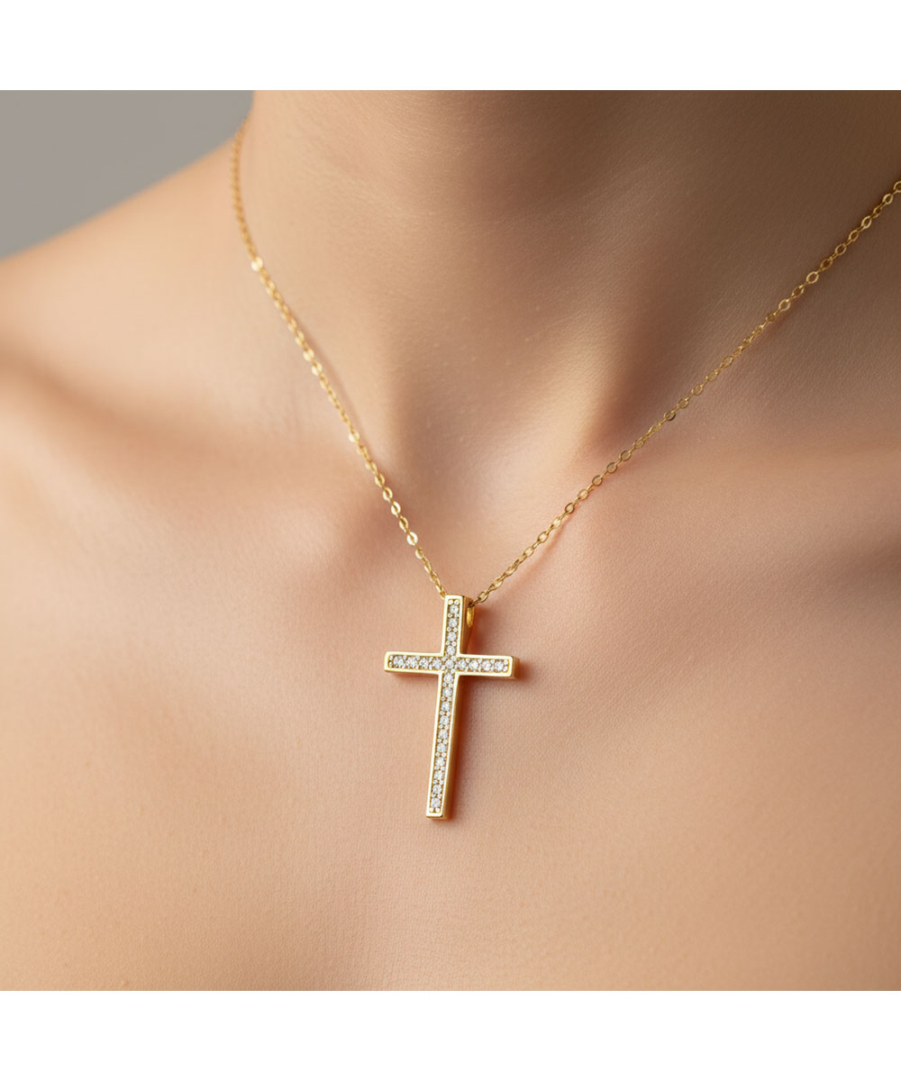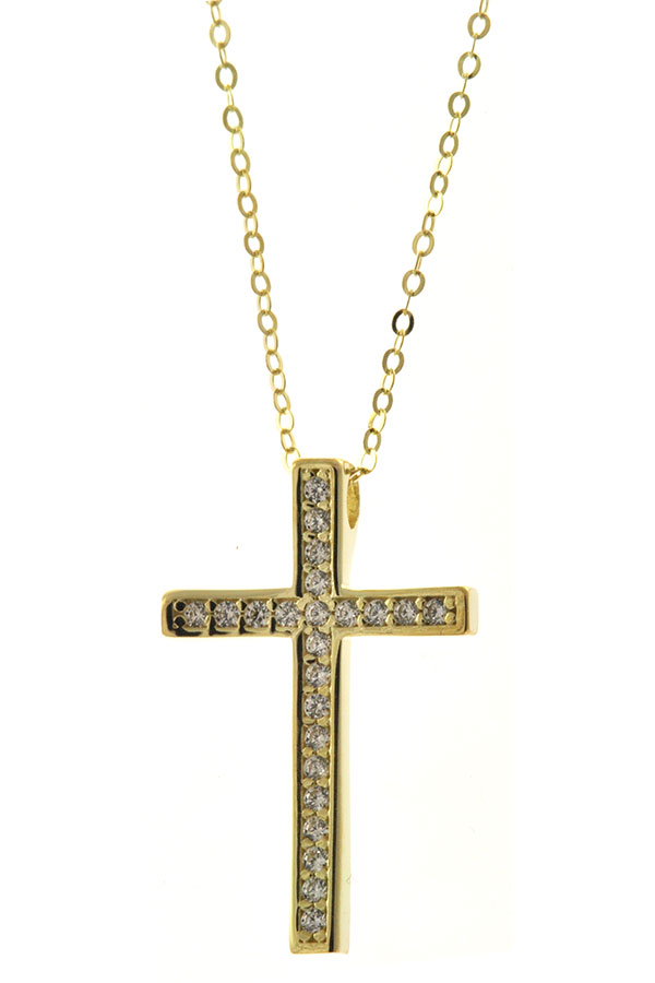 Εντυπωσιακός σταυρός από χρυσό 9 καράτια, διακοσμημένος με λαμπερά ζιργκόν σε όλο το μήκος του σχεδίου. Η συμμετρική τοποθέτηση των πετρών χαρίζει έντονη λάμψη και κομψότητα, δημιουργώντας ένα διαχρονικό κόσμημα.