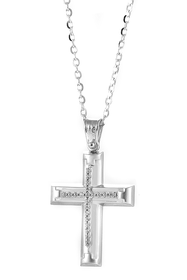 Γυναικείος Σταυρός Λευκόχρυσος 14 καράτια με πέτρες Ζιργκόν. Συνοδεύεται από αλυσίδα λευκόχρυση 14 καράτια.