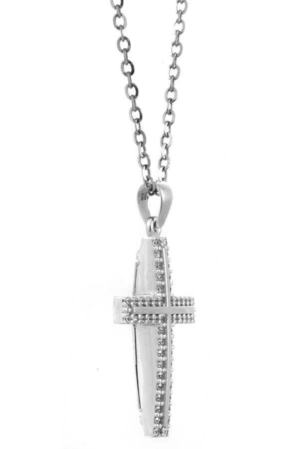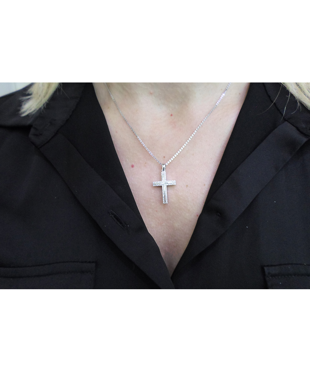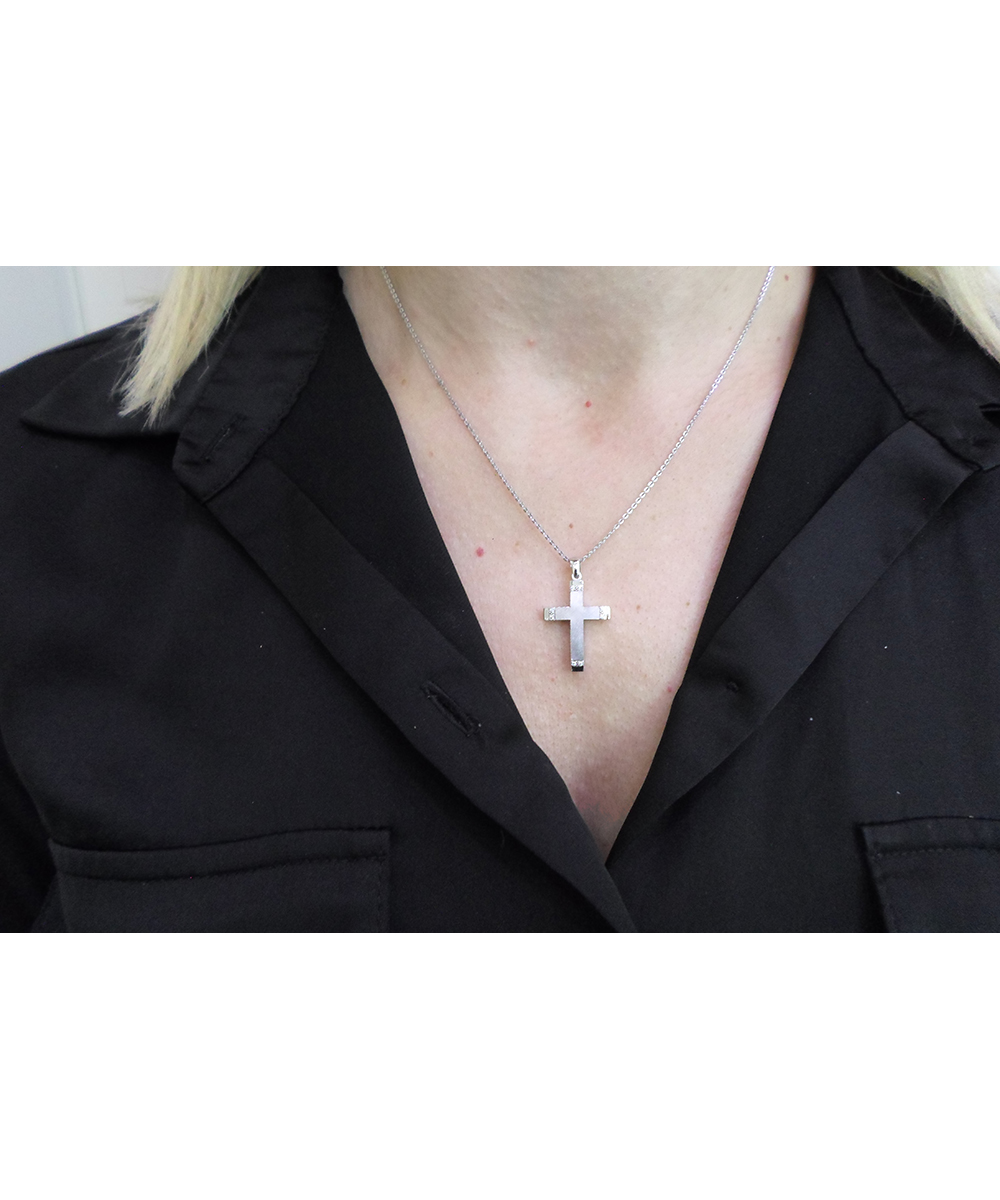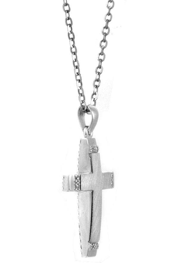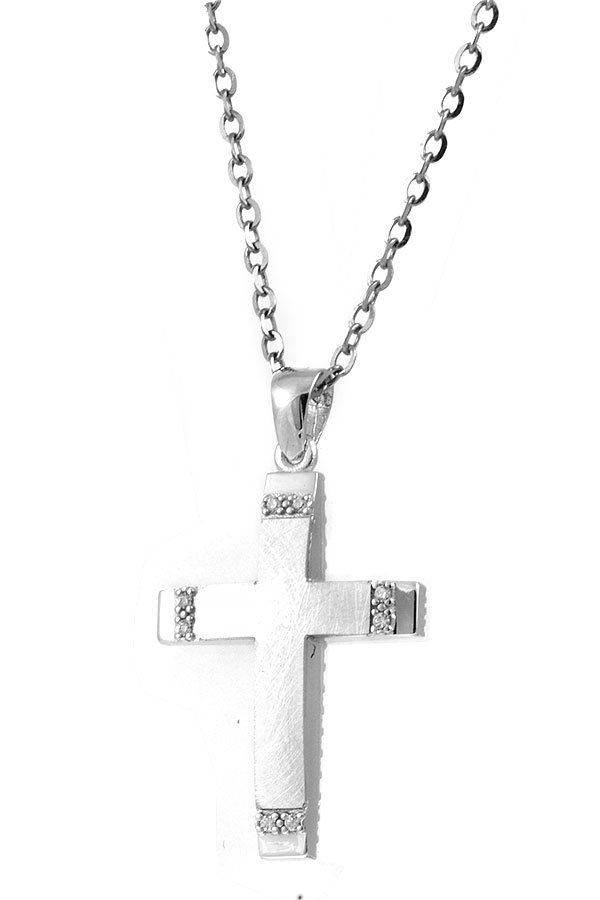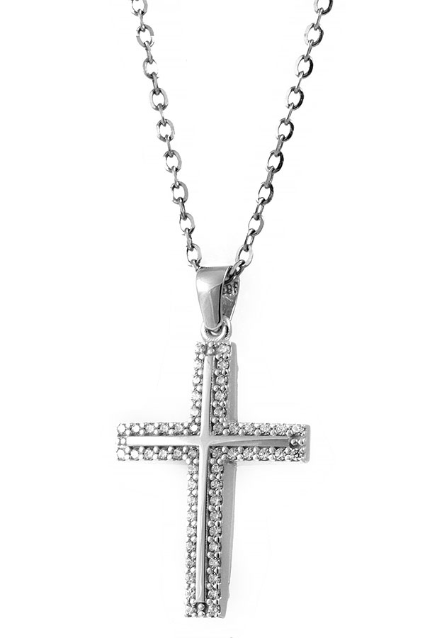 Γυναικείος Σταυρός Λευκόχρυσος 14 καράτια με πέτρες Ζιργκόν. Συνοδεύεται από αλυσίδα λευκόχρυση 14 καράτια.