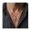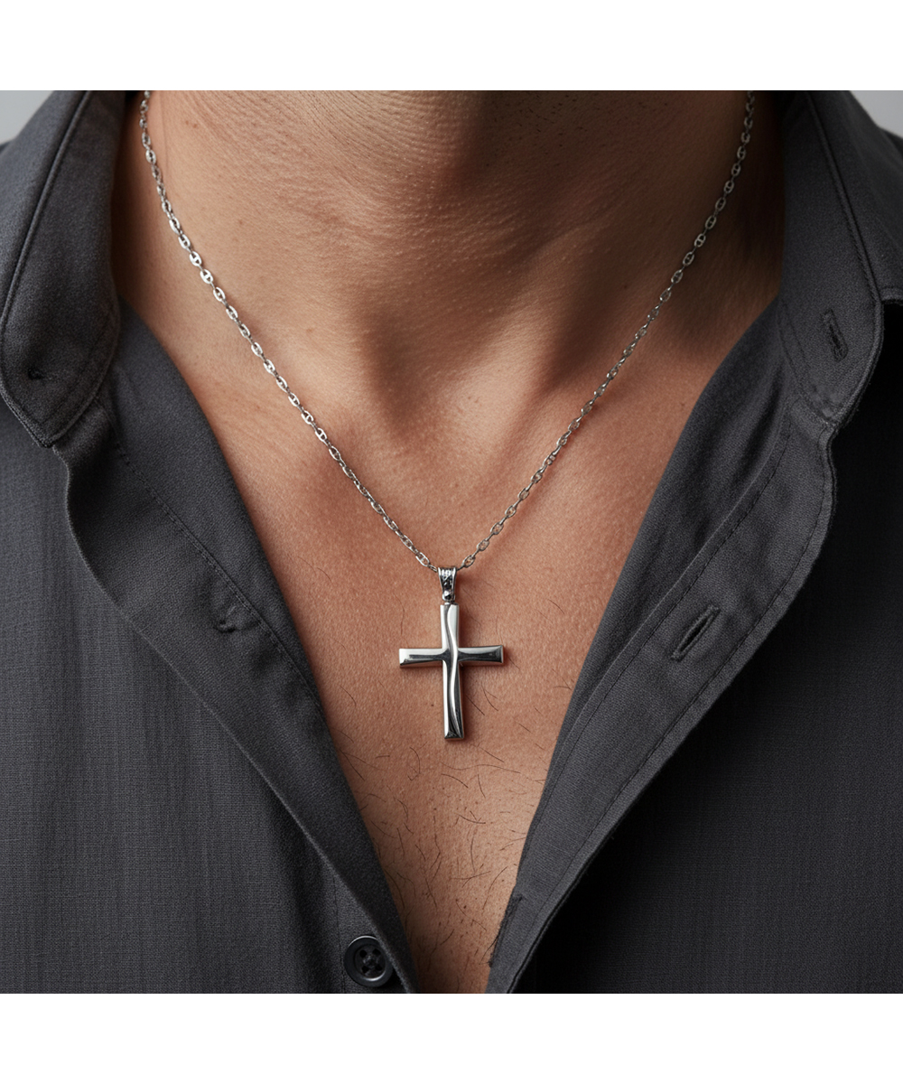 Σταυρός από λευκόxρυσo 14 καράτια με διακριτική καμπύλη γραμμή που προσθέτει μοντέρνο χαρακτήρα στο σχέδιο. Γυαλιστερό φινίρισμα και κομψή αισθητική, ιδανικός για καθημερινή χρήση αλλά και για ιδιαίτερες στιγμές.