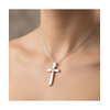 Κομψός σταυρός από λευκόχρυσο 9 καράτια με ζιργκόν τοποθετημένα στο κέντρο του σχεδίου, σχηματίζοντας έναν διακριτικό σταυρό μέσα στον σταυρό. Ο ιδιαίτερος σχεδιασμός προσφέρει κομψότητα και μοναδικό χαρακτήρα.