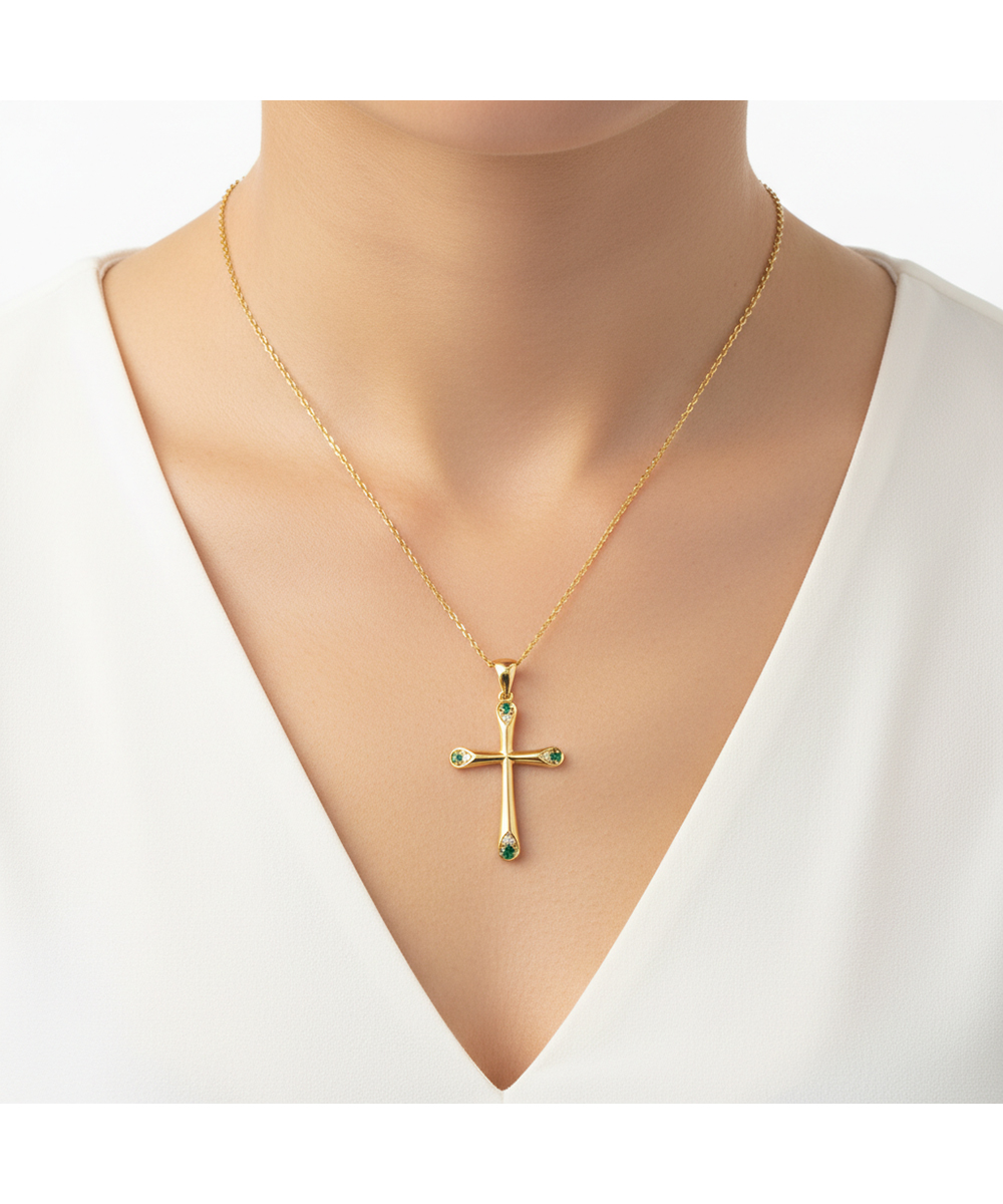 Σταυρός χρυσός 18 καράτια με διαμάντια σε κοπή μπριγιάν (Br) και με σμαράγδια σε σχήμα δάκρυ. Συνδυάζει πολυτέλεια με κλασικό σχεδιασμό – ιδανικό για βάπτιση ή ως μοναδικό δώρο.