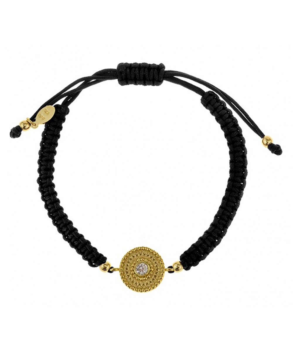 Χειροποίητο μακραμέ βραχιόλι από επιχρυσωμένο ασήμι 925° με στρογγυλό μοτίφ και λαμπερό ζιργκόν στο κέντρο. Ρυθμιζόμενο μέγεθος για άνετη εφαρμογή, ιδανικό για καθημερινή και casual chic εμφάνιση.