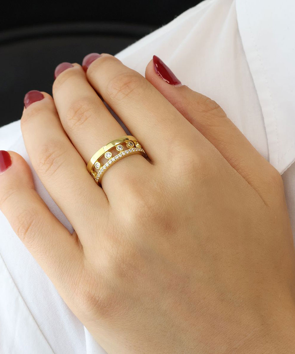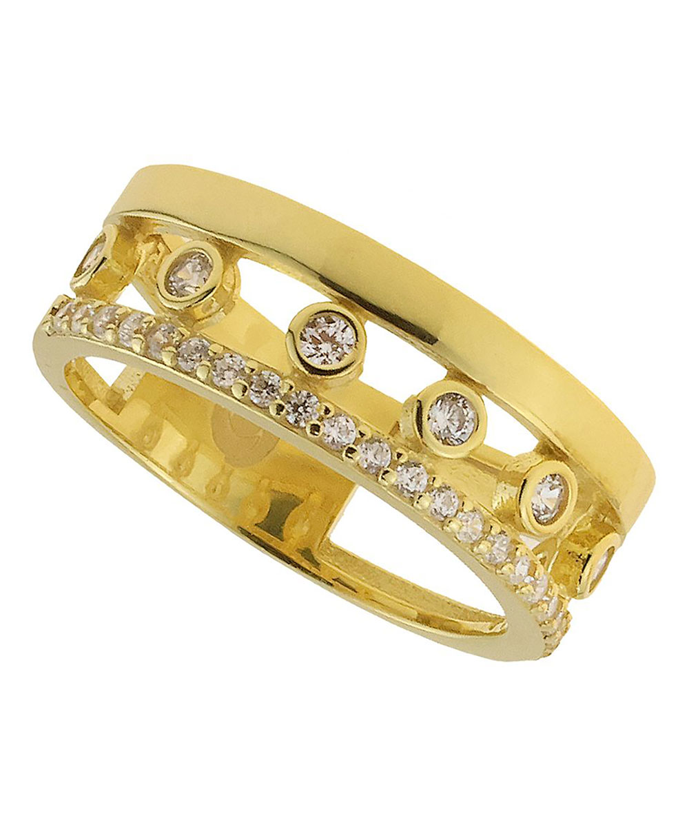 Εντυπωσιακό δαχτυλίδι από επιχρυσωμένο ασήμι 925° με διπλό σχεδιασμό και λευκά ζιργκόν σε κομψή διάταξη. Ένα μοντέρνο κόσμημα που συνδυάζει minimal αισθητική με διακριτική λάμψη, ιδανικό για καθημερινό αλλά και βραδινό στυλ.