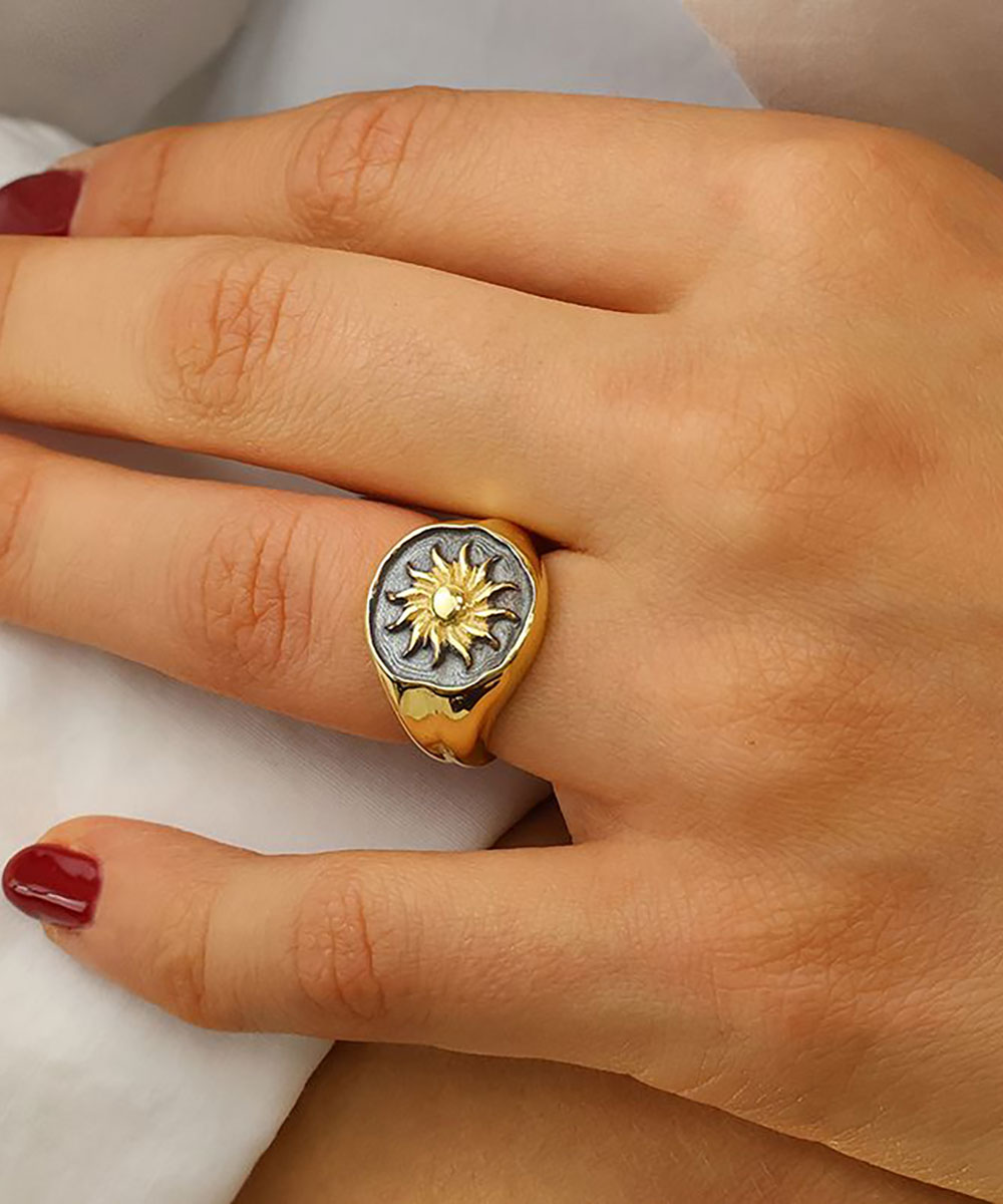 Ιδιαίτερο δαχτυλίδι από επιχρυσωμένο ασήμι 925° με ανάγλυφο μοτίφ ήλιου και οξειδωμένο φόντο. Ένα δυναμικό κόσμημα με συμβολικό χαρακτήρα, που ξεχωρίζει για το μοναδικό του design και την έντονη προσωπικότητα.