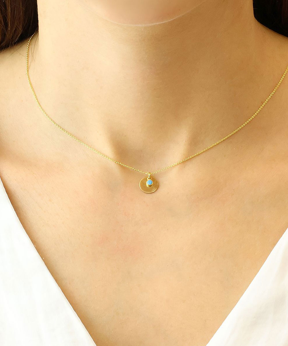 Φρέσκο και μοντέρνο, αυτό το κολιέ από ασήμι 925 διαθέτει τιρκουάζ πέτρα στο κέντρο επιχρυσωμένου δίσκου. Ιδανικό για καλοκαιρινές εμφανίσεις.