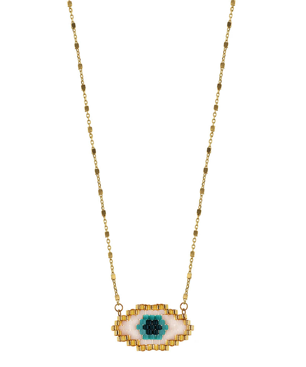Εντυπωσιακό κολιέ από επιχρυσωμένο ασήμι 925° με μοτίφ μάτι, διακοσμημένο με χάντρες σε λευκές και γαλάζιες αποχρώσεις. Ιδανικό για προστασία και στυλ, φοριέται άνετα από το πρωί έως το βράδυ.