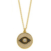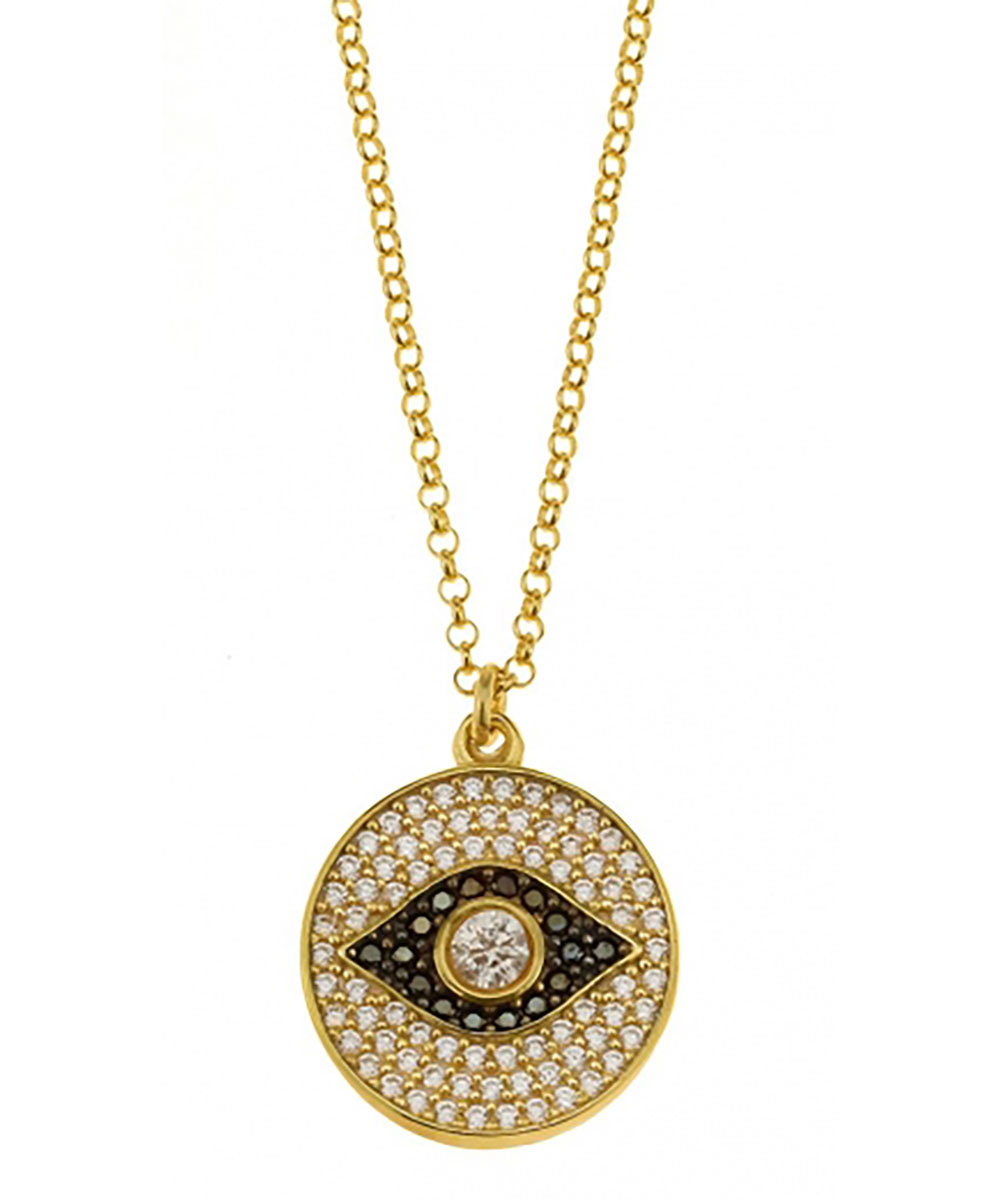 Εντυπωσιακό κολιέ από επιχρυσωμένο ασήμι 925° με στρογγυλό μοτίφ μάτι, διακοσμημένο με λευκά και μαύρα ζιργκόν. Ένα κόσμημα με έντονο συμβολισμό προστασίας και μοντέρνο design, ιδανικό για ξεχωριστές εμφανίσεις.