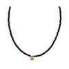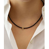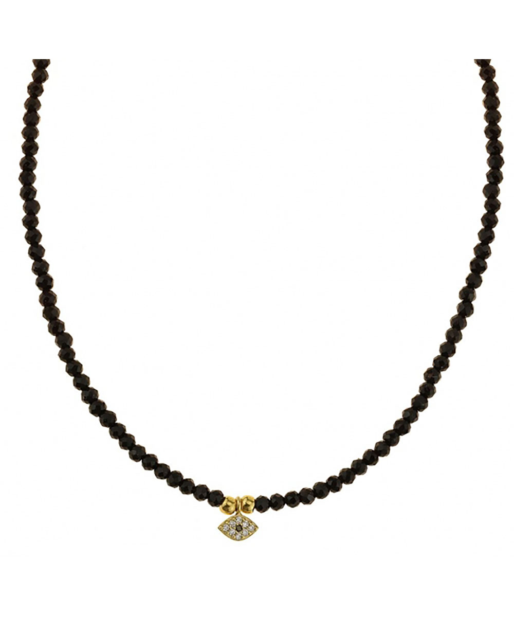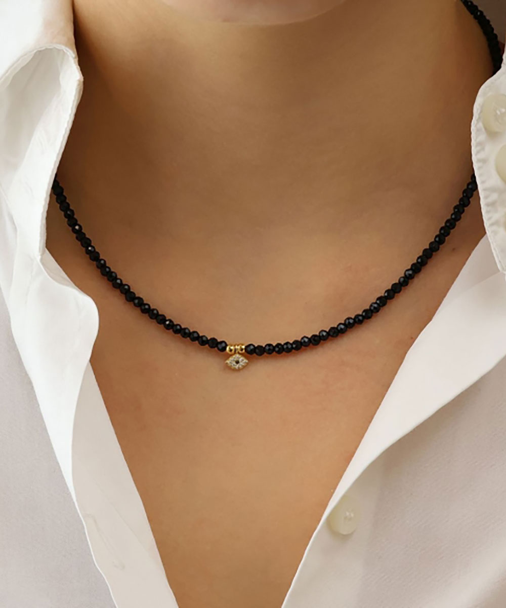 Κομψό γυναικείο κολιέ από επιχρυσωμένο ασήμι 925° με μαύρες χάντρες και διακριτικό στοιχείο ματιού στο κέντρο. Ένα elegant κόσμημα που συνδυάζει μοντέρνο στυλ και διαχρονικό συμβολισμό.