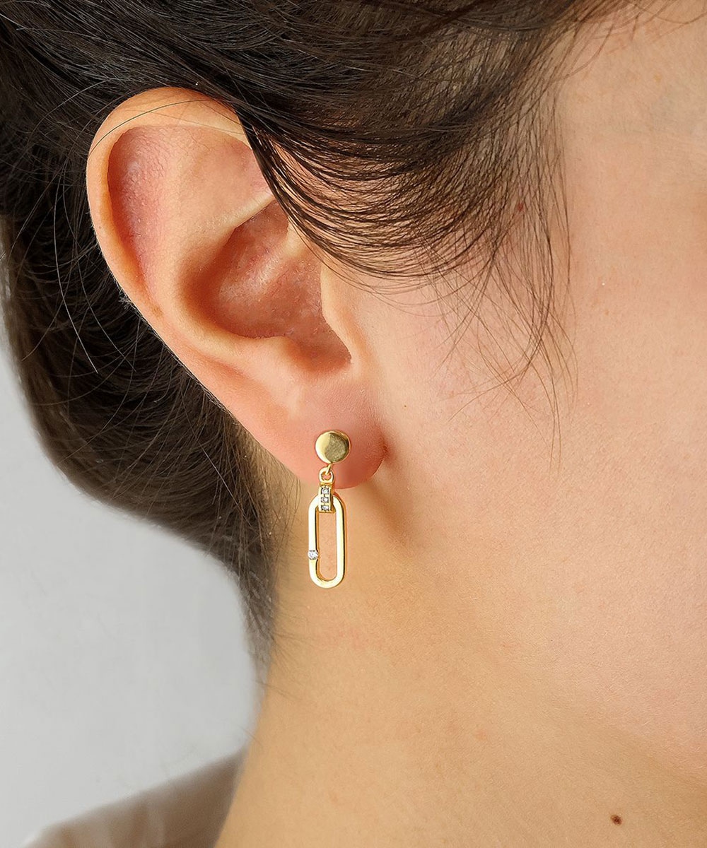 Μοντέρνα κρεμαστά σκουλαρίκια από επιχρυσωμένο ασήμι 925°, με ορθογώνιο κρίκο και διακριτικά ζιργκόν. Ένα κομψό κόσμημα που συνδυάζει minimal αισθητική και διακριτική λάμψη.