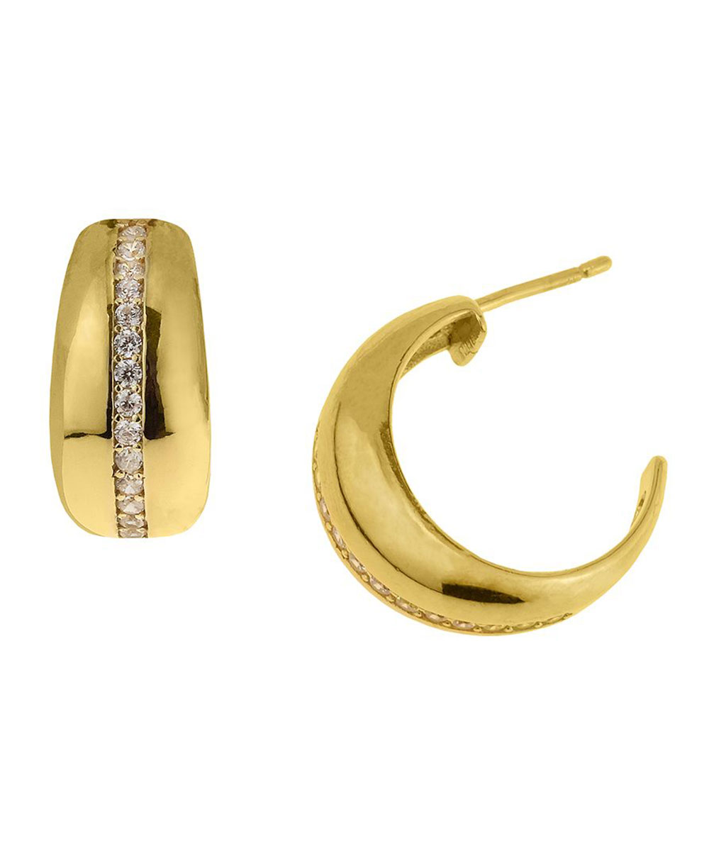 Εντυπωσιακά σκουλαρίκια κρίκοι από επιχρυσωμένο ασήμι 925°, με ενσωματωμένη σειρά λευκών ζιργκόν που χαρίζουν διακριτική πολυτέλεια. Κλασικό αλλά σύγχρονο κόσμημα, ιδανικό για όλες τις ώρες.