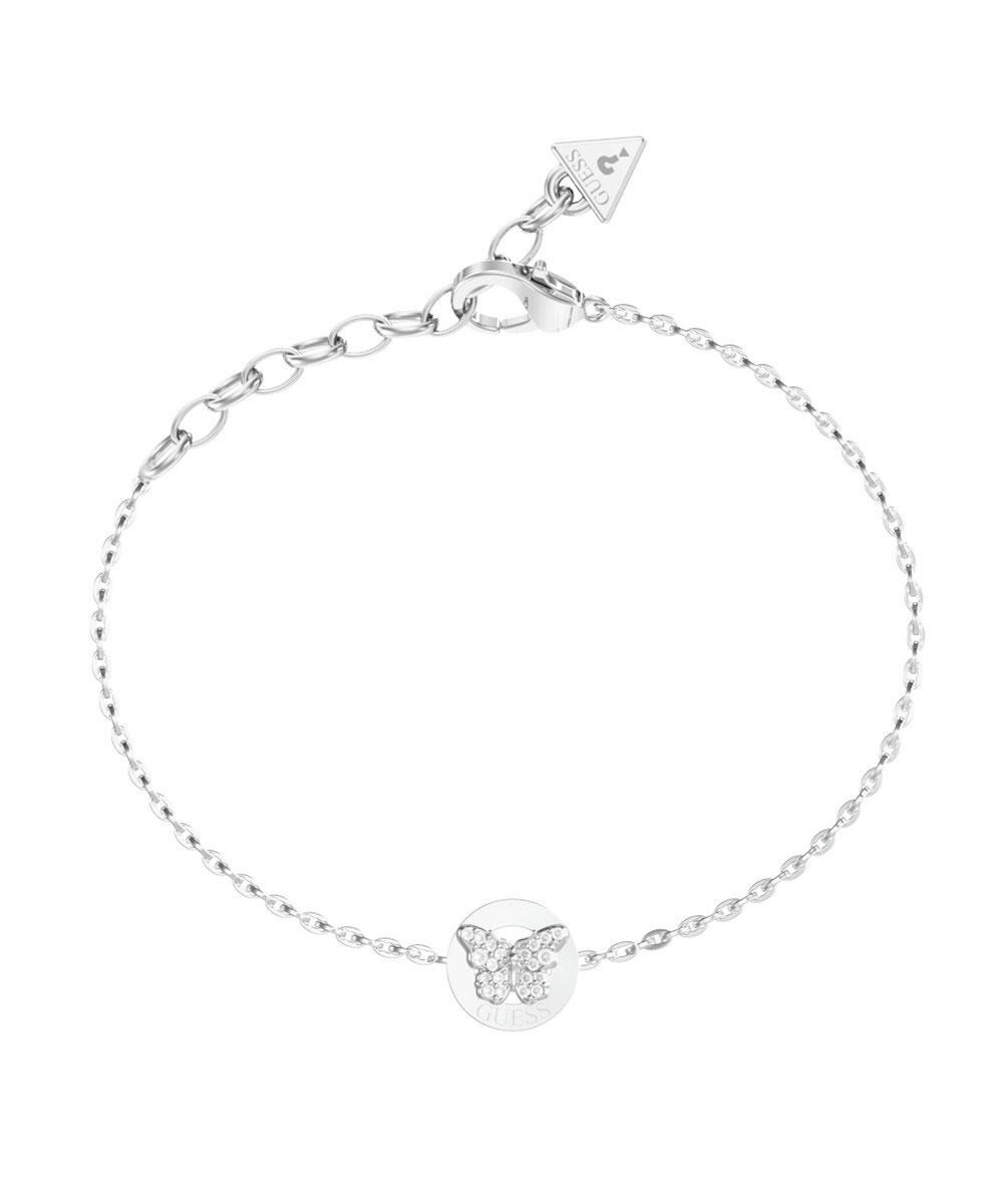 Γυναικείο βραχιόλι Guess από ανοξείδωτο ατσάλι με στρογγυλό μοτίφ πεταλούδα και λευκές πέτρες Ζιργκόν.