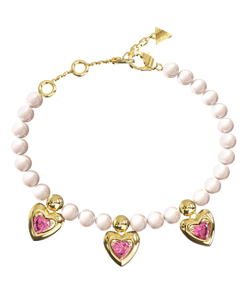 Γυναικείο βραχιόλι Guess από επιχρυσωμένο ανοξείδωτο ατσάλι με κρεμαστές καρδιές και ροζ πέτρες Ζιργκόν.