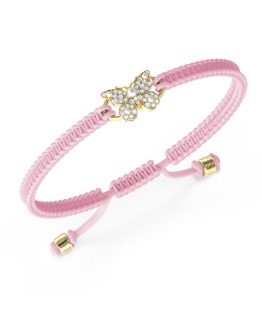 Γυναικείο βραχιόλι Guess από επιχρυσωμένο ανοξείδωτο ατσάλι με μοτίφ πεταλούδα, λευκές πέτρες Ζιργκόν και ροζ κορδόνι.