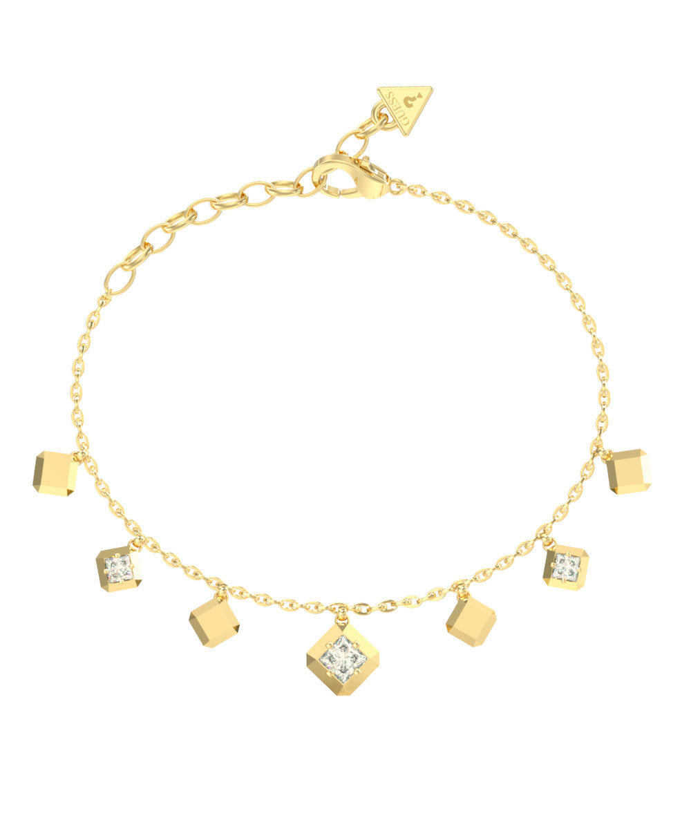 Γυναικείο βραχιόλι Guess από επιχρυσωμένο ανοξείδωτο ατσάλι με κρεμαστά μοτίφ και λευκές πέτρες Ζιργκόν.