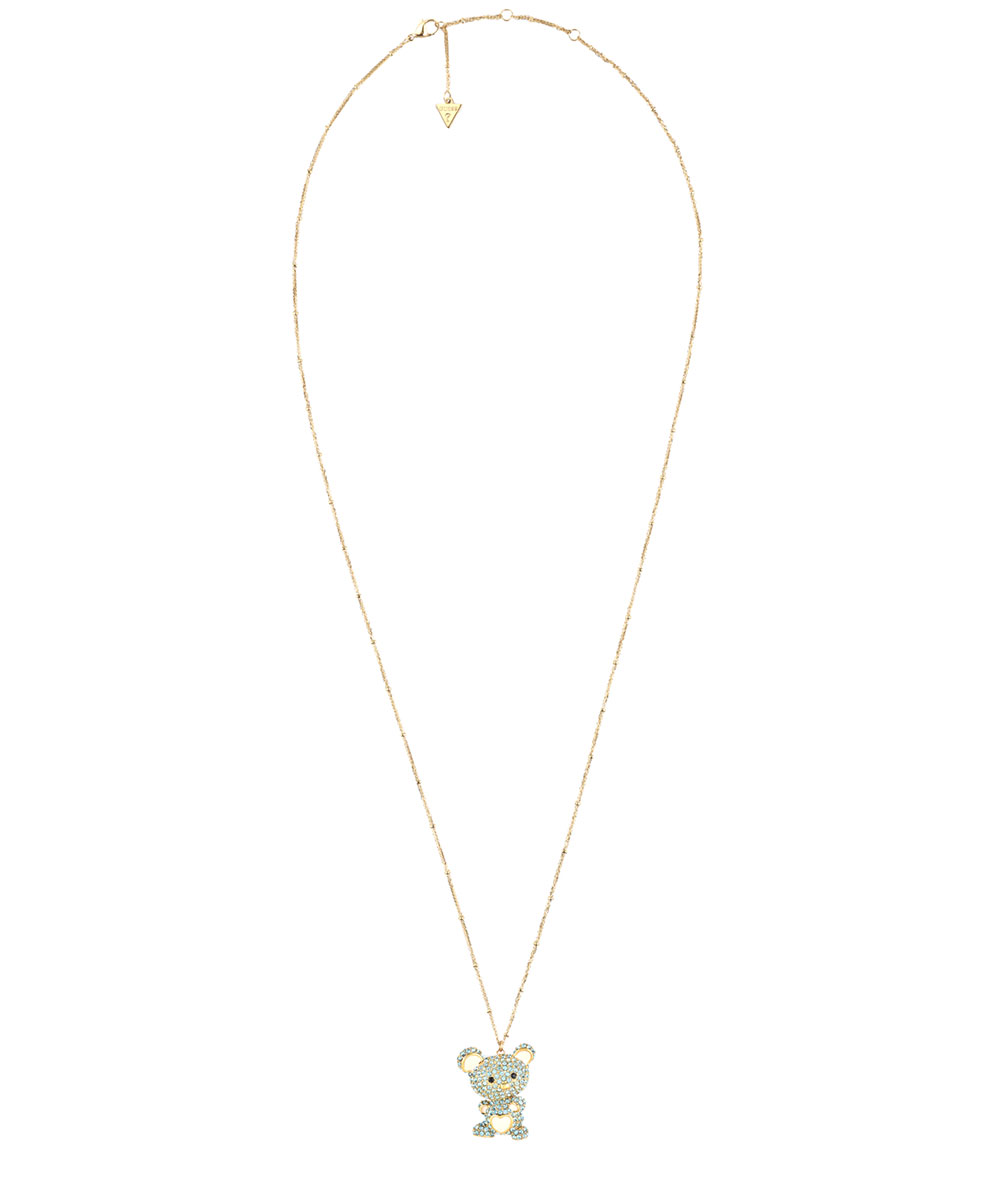 Γυναικείο κολιέ Guess από επιχρυσωμένο ανοξείδωτο ατσάλι με κρεμαστό μοτίφ και με γαλάζιες πέτρες Ζιργκόν.