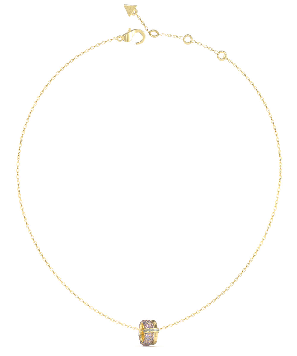 Γυναικείο κολιέ Guess από επιχρυσωμένο ανοξείδωτο ατσάλι με κρεμαστό μοτίφ και με ροζ πέτρες Ζιργκόν.