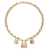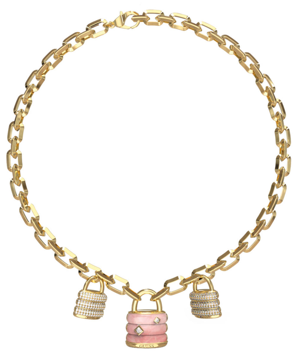 Γυναικείο κολιέ Guess από επιχρυσωμένο ανοξείδωτο ατσάλι με κρεμαστά λουκετάκια, λευκές πέτρες Ζιργκόν και με ροζ σμάλτο.