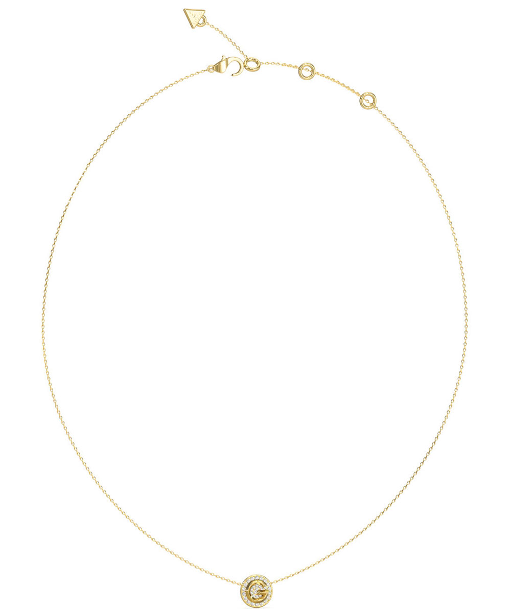 Γυναικείο κολιέ Guess από επιχρυσωμένο ανοξείδωτο ατσάλι με κρεμαστό λογότυπο και με λευκές πέτρες Ζιργκόν.