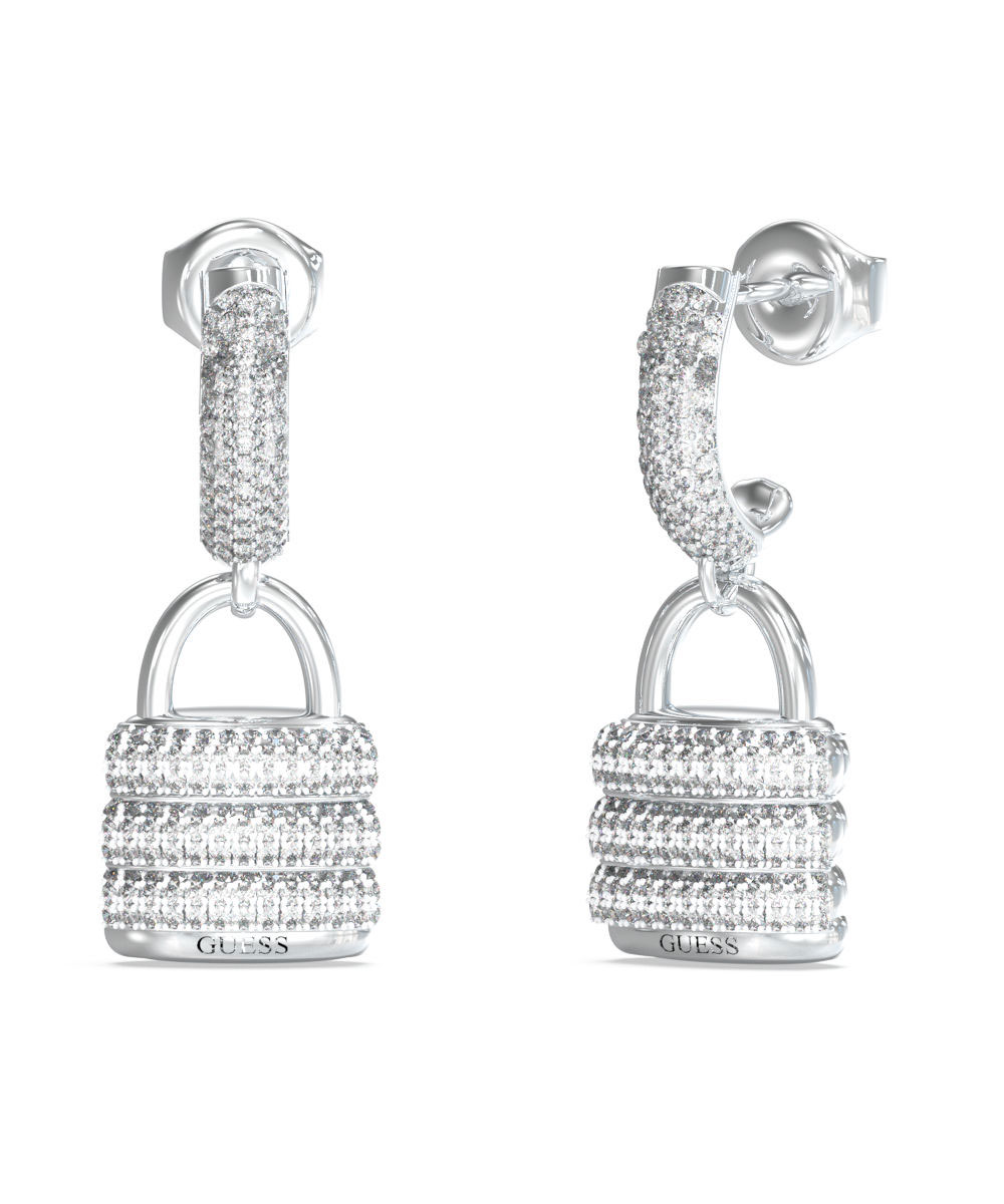 Γυναικεία σκουλαρίκια Guess από ανοξείδωτο ατσάλι με σχέδιο λουκετάκι και με λευκές πέτρες Ζιργκόν.