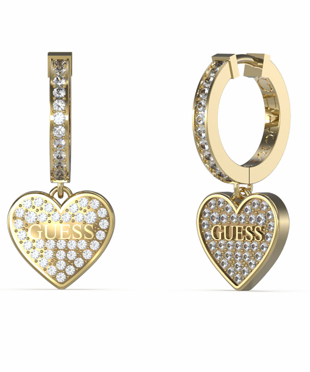 Γυναικεία σκουλαρίκια Guess από επιχρυσωμένο ανοξείδωτο ατσάλι με καρδιές και με λευκές πέτρες Ζιργκόν.