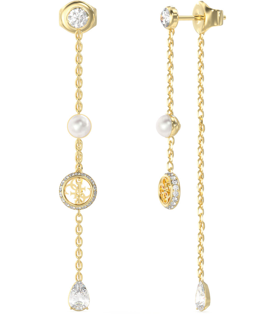 Γυναικεία σκουλαρίκια Guess από επιχρυσωμένο ανοξείδωτο ατσάλι με λευκές πέτρες Ζιργκόν και με λευκές πέρλες.