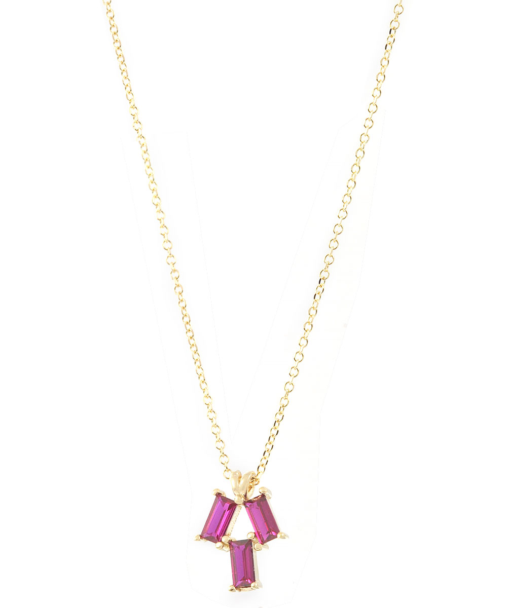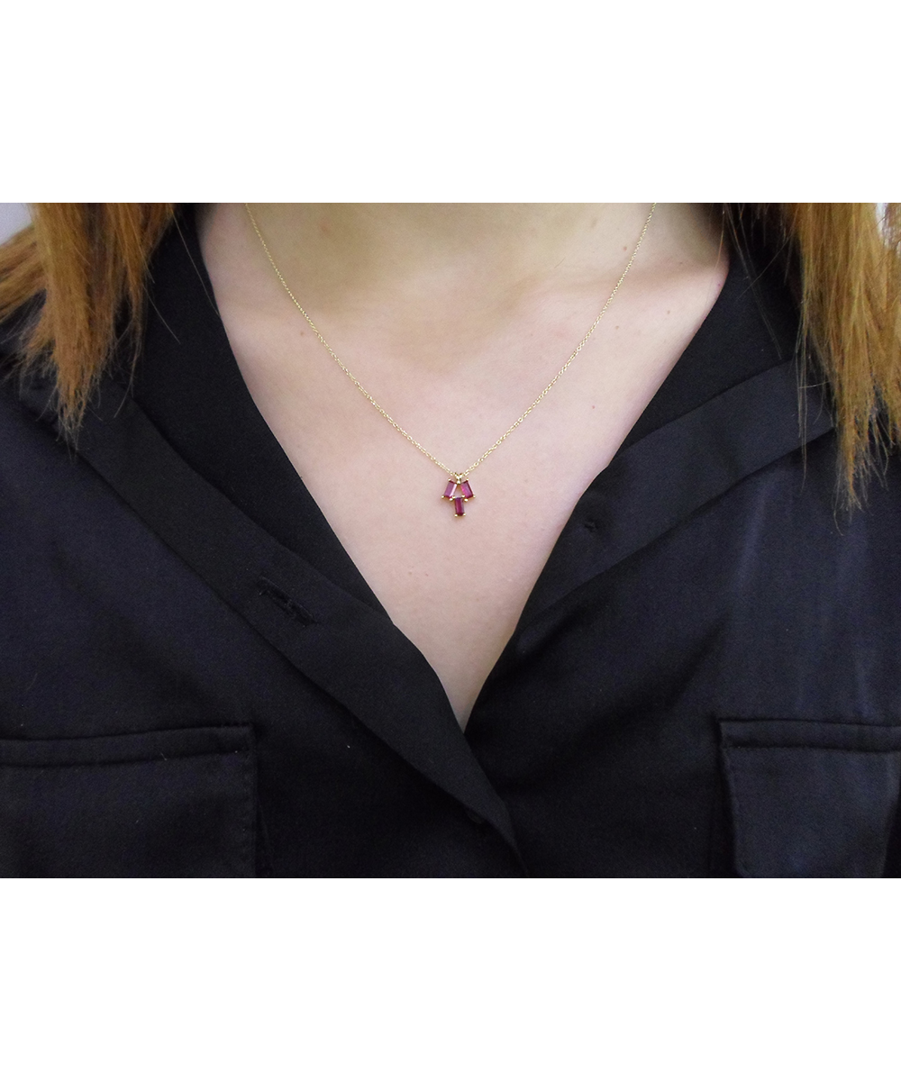 Εντυπωσιακό χρυσό κολιέ 14 καράτια με φυσικά ρουμπίνια κοπής baguette, τοποθετημένα σε κομψό γεωμετρικό μοτίβο. Το ζωηρό κόκκινο χρώμα των ρουμπινιών προσδίδει δυναμισμό και πολυτέλεια, καθιστώντας το ιδανική επιλογή για καθημερινή κομψότητα αλλά και ιδιαίτερες εμφανίσεις. Ένα κόσμημα που ξεχωρίζει για τον μοντέρνο χαρακτήρα και τη διαχρονική αξία του.