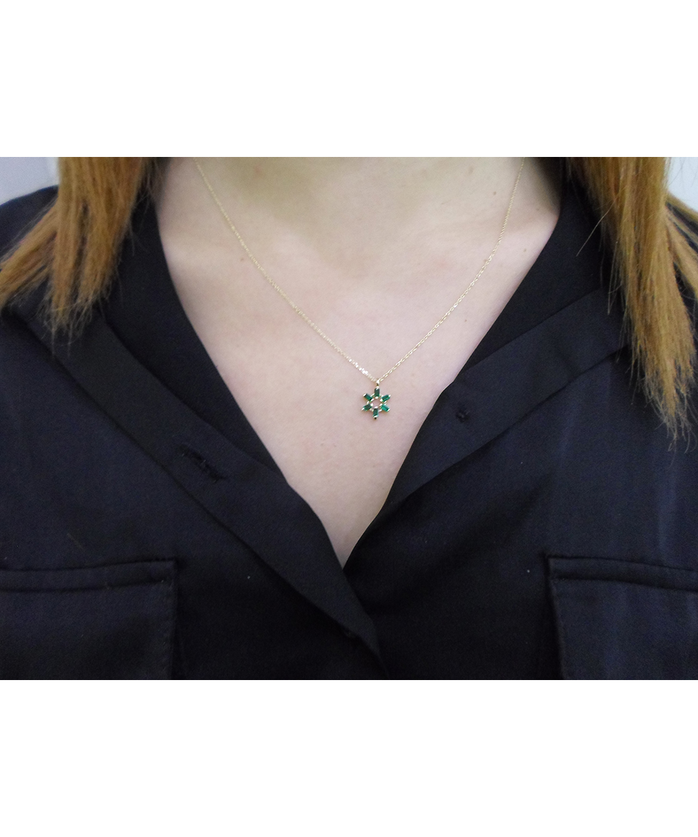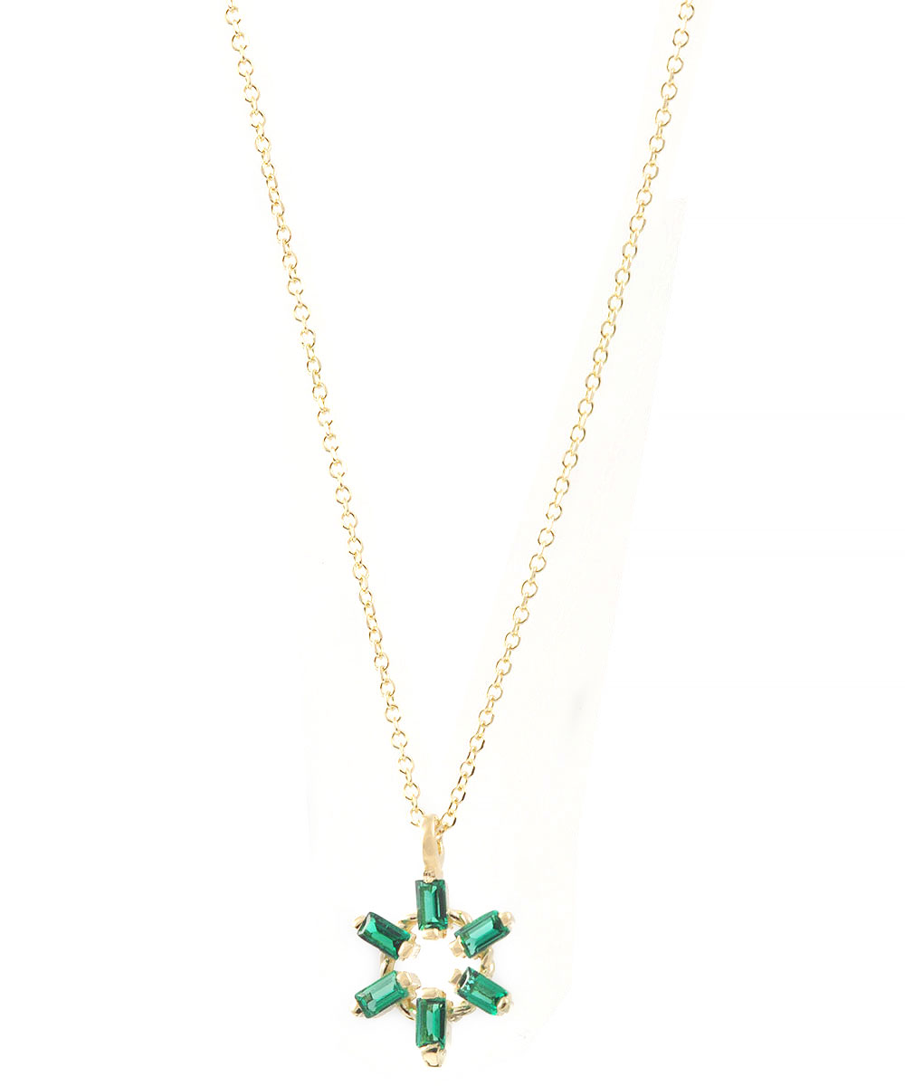 Εντυπωσιακό κολιέ από χρυσό 14 καράτια με σμαράγδια baguette, δεμένα σε μοντέρνο κυκλικό σχέδιο. Το ζωηρό πράσινο χρώμα προσδίδει φρεσκάδα και κομψότητα, ιδανικό για γυναίκες που αγαπούν τα ξεχωριστά κοσμήματα.