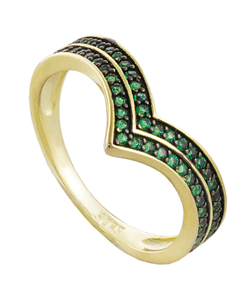 Ένα μοντέρνο και κομψό επιχρυσωμένο δαχτυλίδι από ασήμι 925 σε wave design που αγκαλιάζει το δάχτυλο με μοναδική χάρη. Διακοσμημένο με πράσινα ζιρκόν σε δύο παράλληλες σειρές, προσφέρει έντονη λάμψη και χρώμα, ιδανικό για όσες αγαπούν τα statement κοσμήματα με minimal αισθητική. Φοριέται εύκολα από το πρωί μέχρι το βράδυ και συνδυάζεται άψογα με χρυσά ή πράσινα κοσμήματα για ένα ολοκληρωμένο, σύγχρονο look.