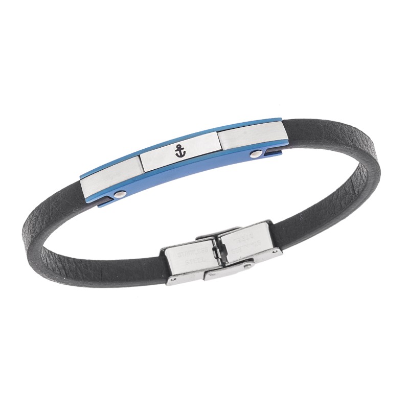Βραχιόλι Senza Steel, Black Leather Strap, ασημί & μπλε σχέδιο με άγκυρα