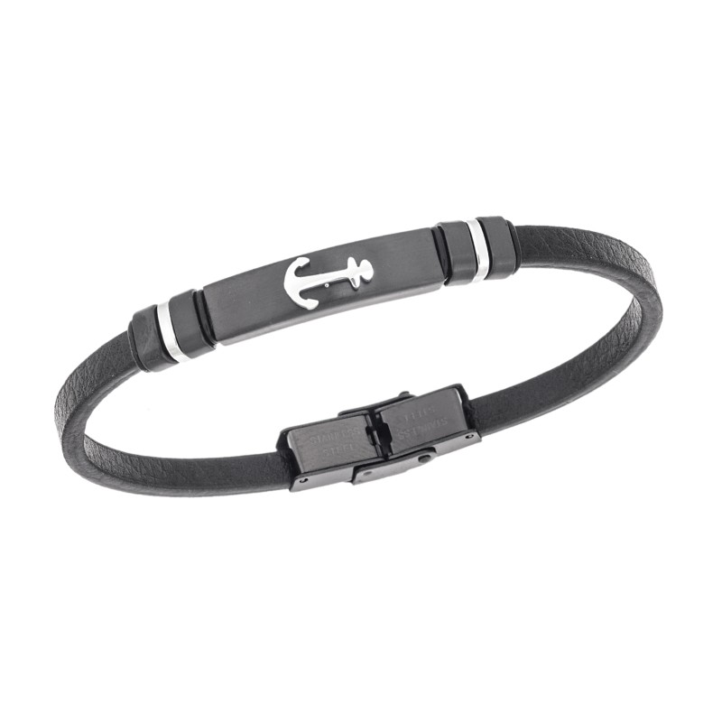 Βραχιόλι Senza Steel, Black Leather Strap With Anchor