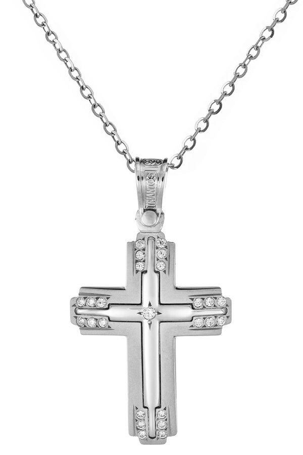 Triantos Σταυρός Λευκόxρυσoς 14 Καράτια με πέτρες Ζιργκόν. Συνοδεύεται από αλυσίδα λευκόχρυση 9 καράτια.