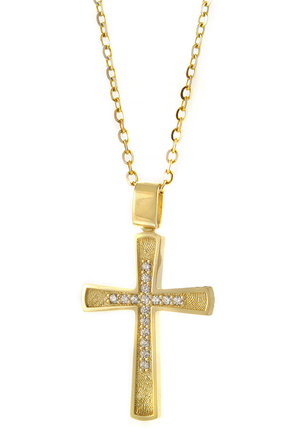 Γυναικείος σταυρός Val'Oro χρυσός 14 καράτια με πέτρες Ζιργκόν. Συνοδεύεται από αλυσίδα χρυσή 14 καράτια.