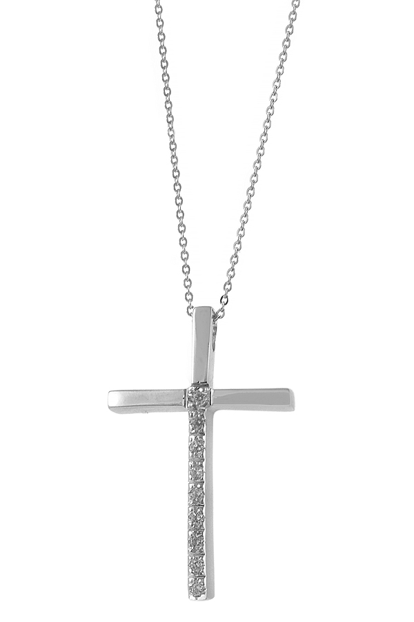 Γυναικείος σταυρός Val'Oro λευκόχρυσος 14 καράτια με πέτρες Ζιργκόν. Συνοδεύεται από αλυσίδα λευκόχρυση 14 καράτια.