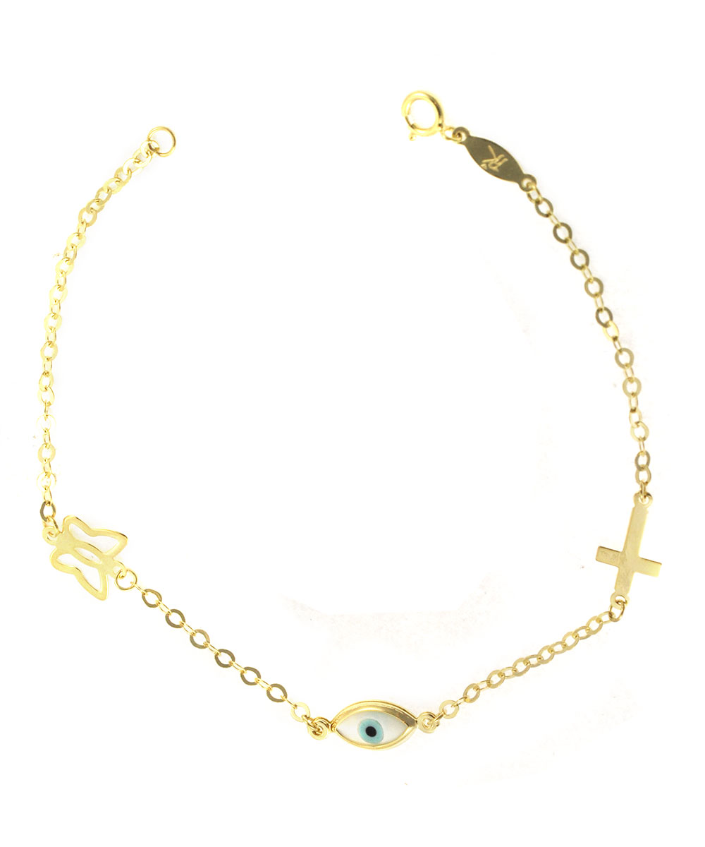 Κομψό χρυσό βραχιόλι 9 καράτια με γαλάζιο ματάκι, πεταλούδα και σταυρό. Ένα μοναδικό φυλαχτό που συνδυάζει προστασία, πίστη και θηλυκότητα.