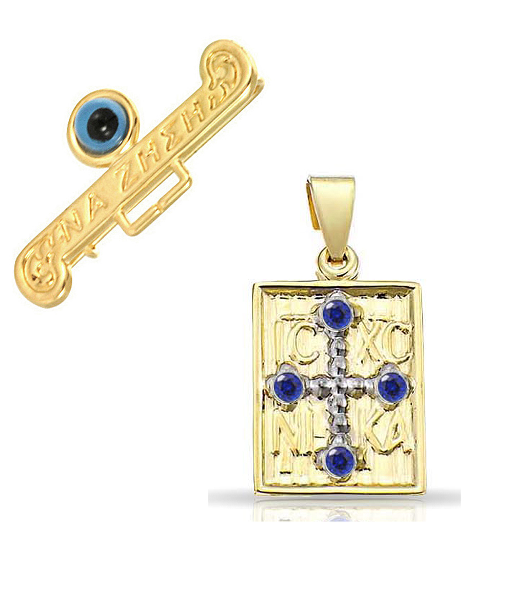 Κωνσταντινάτο Χρυσό 9 Καράτια με μπλε πέτρες Ζιργκόν.Συνοδεύεται από καρφίτσα Χρυσή 9 Καράτια.