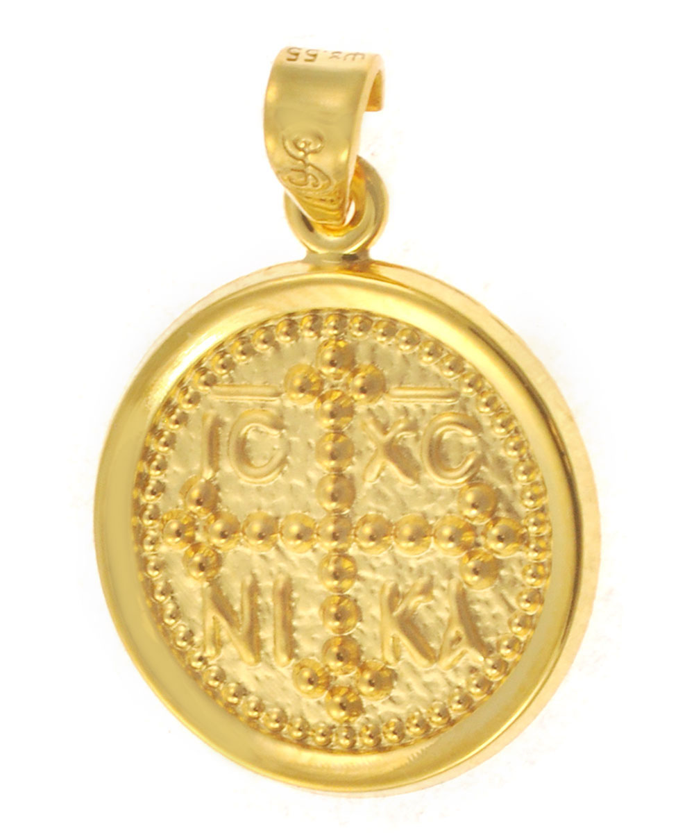 Στρογγυλό χρυσό φυλαχτό 14 καράτια με ανάγλυφο σταυρό IC XC NIKA και κομψή υφή στο φόντο. Μία εκλεπτυσμένη επιλογή με πνευματικό χαρακτήρα, ιδανική για δώρο βάπτισης ή ευλογίας.