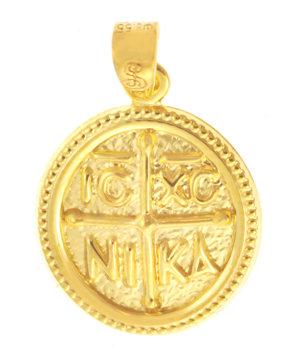 Εντυπωσιακό στρογγυλό φυλαχτό IC XC NIKA από χρυσό 14 καράτια με διακριτή ανάγλυφη λεπτομέρεια. Ιδανικό δώρο για βάπτιση ή θρησκευτική προσφορά με διαχρονικό χαρακτήρα.