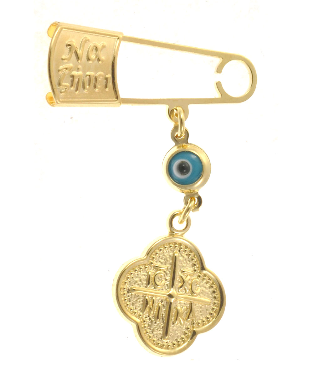 Πρωτότυπο φυλαχτό χρυσό 9 καράτια με σταυρό IC XC NIKA σε τετράφυλλο περίγραμμα, ματάκι και παραμάνα "Να Ζήσει". Ιδανικό για προστασία και ευλογία στο νεογέννητο.