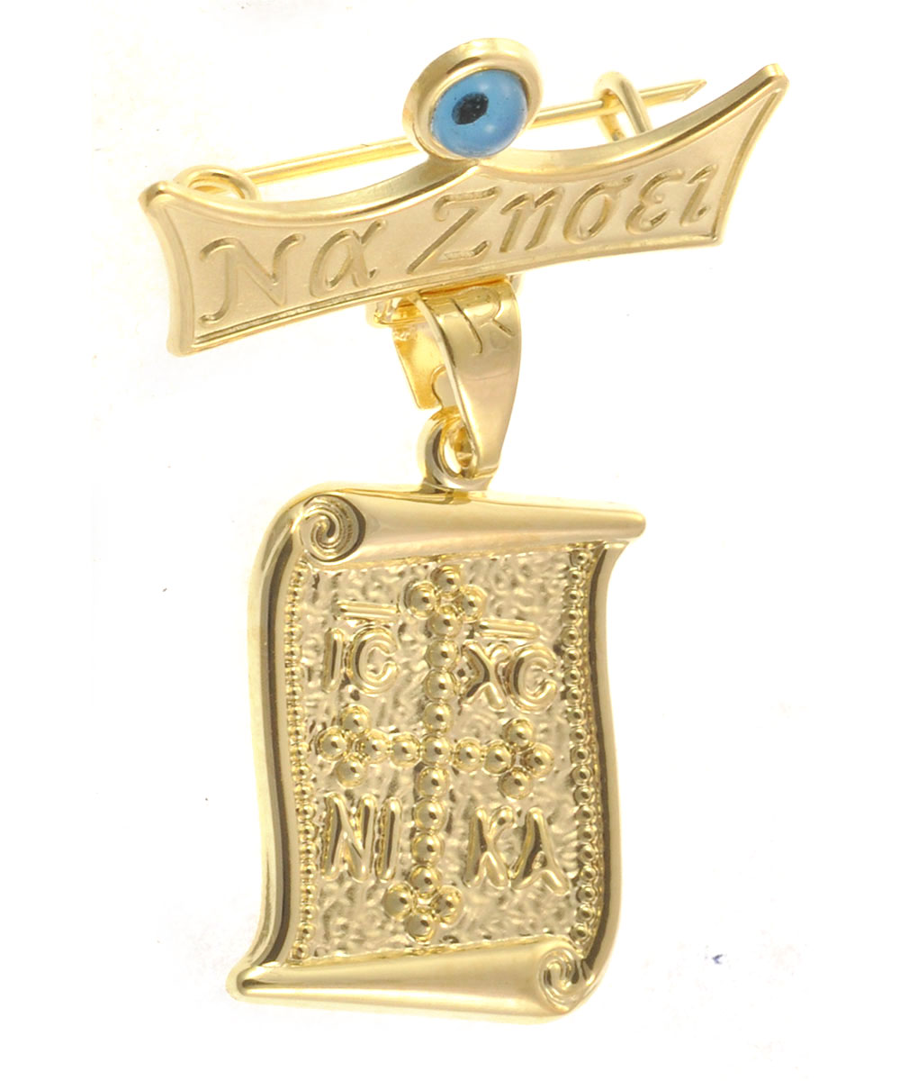 Φυλαχτό τύπου «πάπυρος» με ανάγλυφο IC XC NIKA και μπλε μάτι στην παραμάνα. Κατασκευασμένο από χρυσό 9 καράτια, αποτελεί εξαιρετικό δώρο για βάπτιση αγοριού ή κοριτσιού.