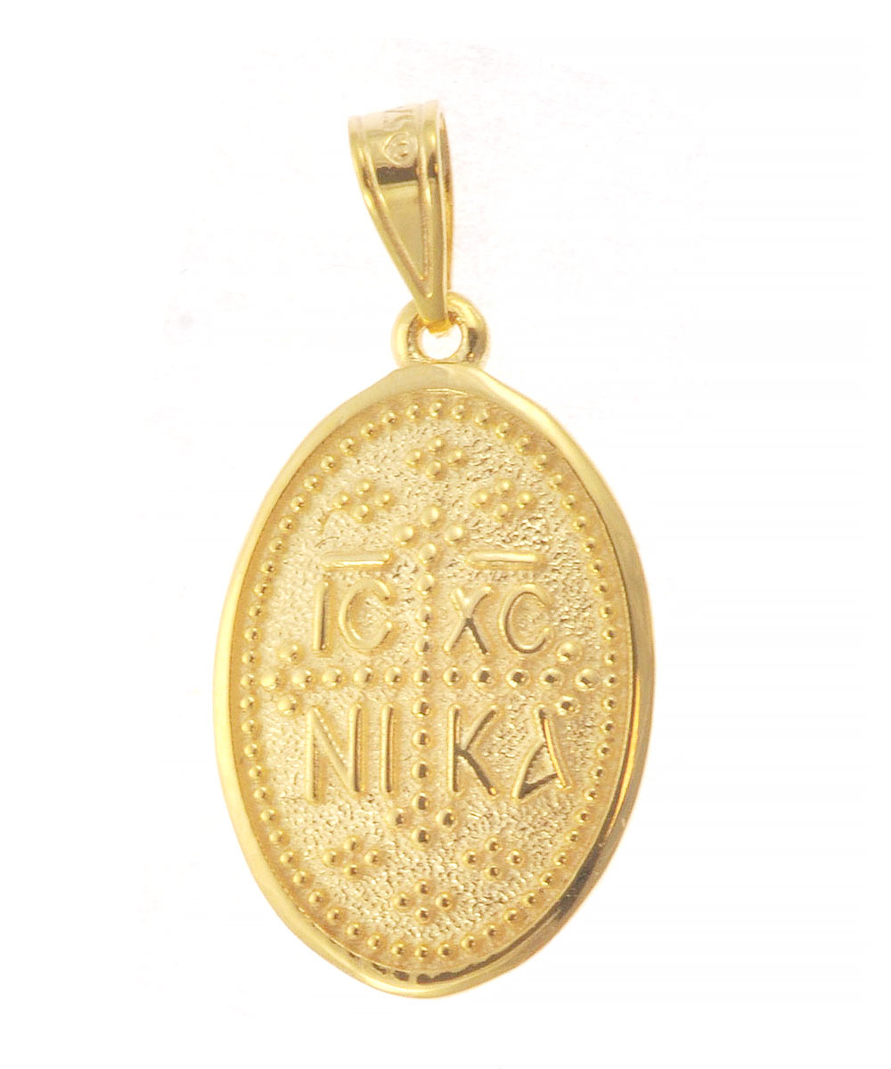 Κλασικό μενταγιόν Κωνσταντινάτο από χρυσό 9 καράτια σε οβάλ σχήμα, με ανάγλυφο σταυρό και την επιγραφή IC XC NIKA. Η διακριτική, σαγρέ υφή στο φόντο αναδεικνύει το σύμβολο και προσδίδει παραδοσιακό χαρακτήρα. Ιδανική επιλογή για καθημερινή χρήση ή για ένα διαχρονικό δώρο με συμβολισμό.
