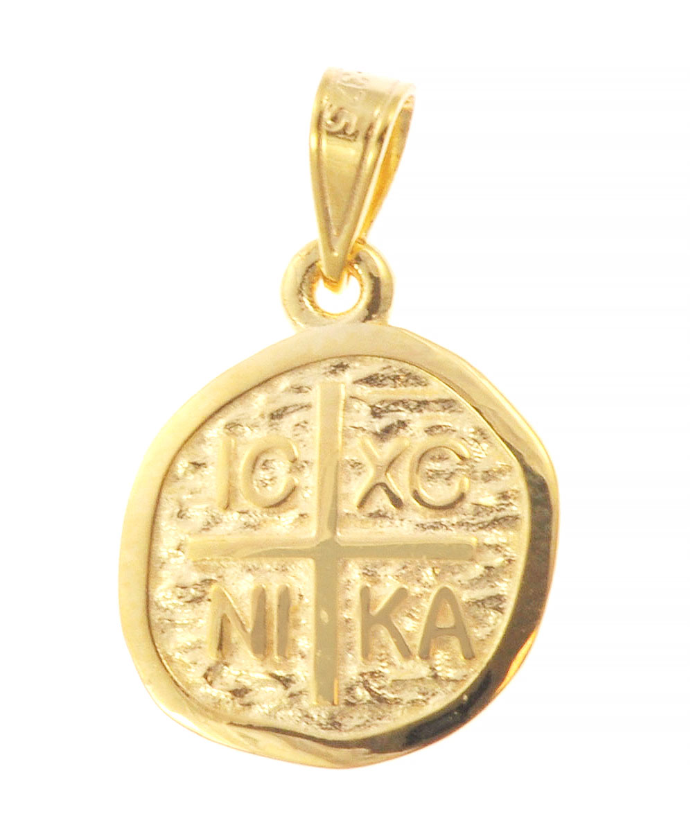 Στρογγυλό Κωνσταντινάτο από χρυσό 9 καράτια με ανάγλυφο σταυρό και την επιγραφή IC XC NIKA. Το λουστρέ περίγραμμα αγκαλιάζει τη σαγρέ επιφάνεια, δημιουργώντας κομψή αντίθεση. Ένα διαχρονικό θρησκευτικό κόσμημα, ιδανικό για άνδρα ή γυναίκα.