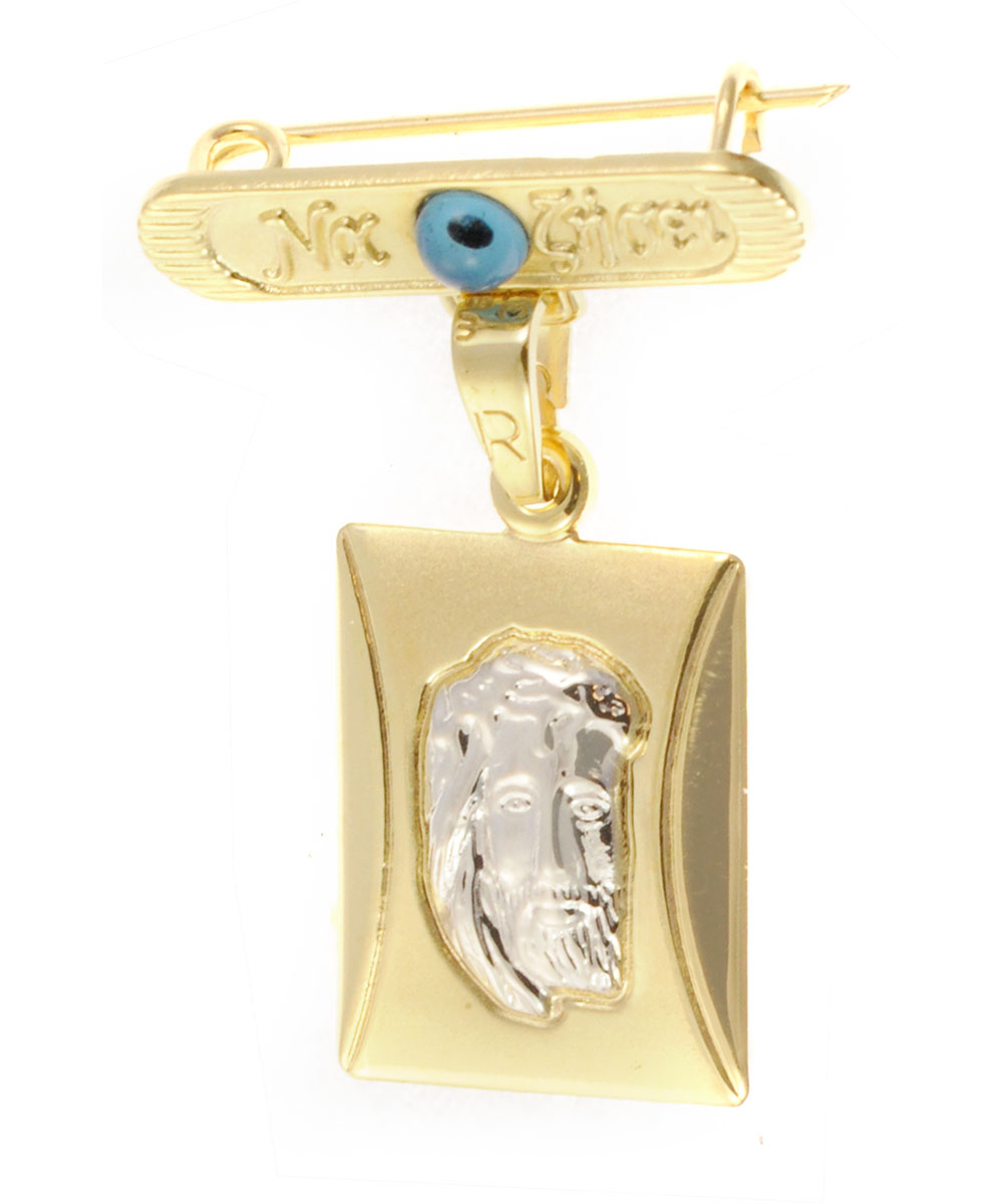 Κομψό φυλαχτό από χρυσό 9 καράτια με παράσταση του Ιησού Χριστού σε δίχρωμο φινίρισμα και παραμάνα με την ευχή «Να Ζήσει» και ματάκι προστασίας. Ένα διαχρονικό και ευλογημένο δώρο για νεογέννητο ή βάπτιση.