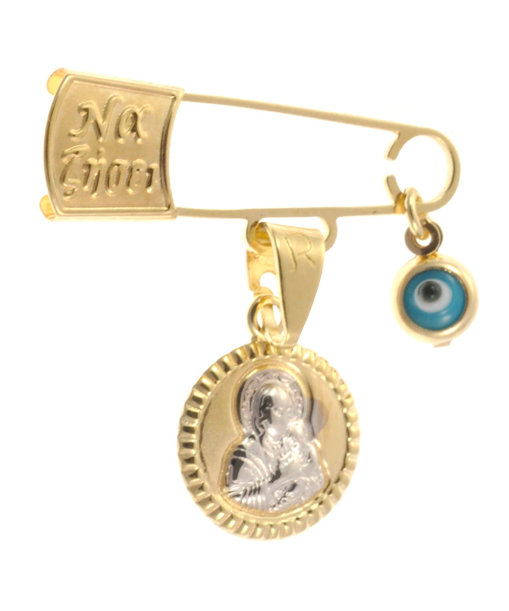 Μοναδικό φυλαχτό από χρυσό 9 καράτια σε στρογγυλό πλαίσιο με παραμάνα και μπλε ματάκι. Φυλαχτό βάπτισης για κορίτσι ή αγόρι.