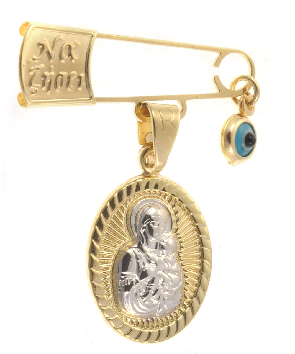 Κλασική και κομψή παναγίτσα από χρυσό 9 καράτια με οβάλ παράσταση σε λευκό και χρυσό φινίρισμα. Συνοδεύεται με παραμάνα και μπλε ματάκι. Το ιδανικό δώρο για βάπτιση ή νεογέννητο, που συνδυάζει ευλογία και στυλ.