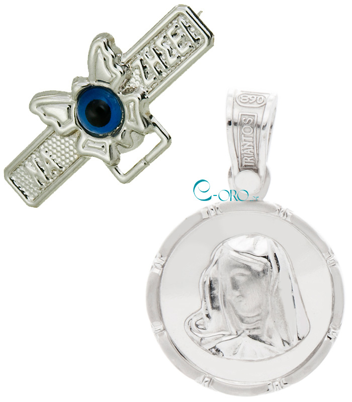 Παναγίτσα Λευκόχρυση 14 Καράτια. Το μενταγιόν συνοδεύεται από καρφίτσα Λευκόχρυση 9 Καράτια.