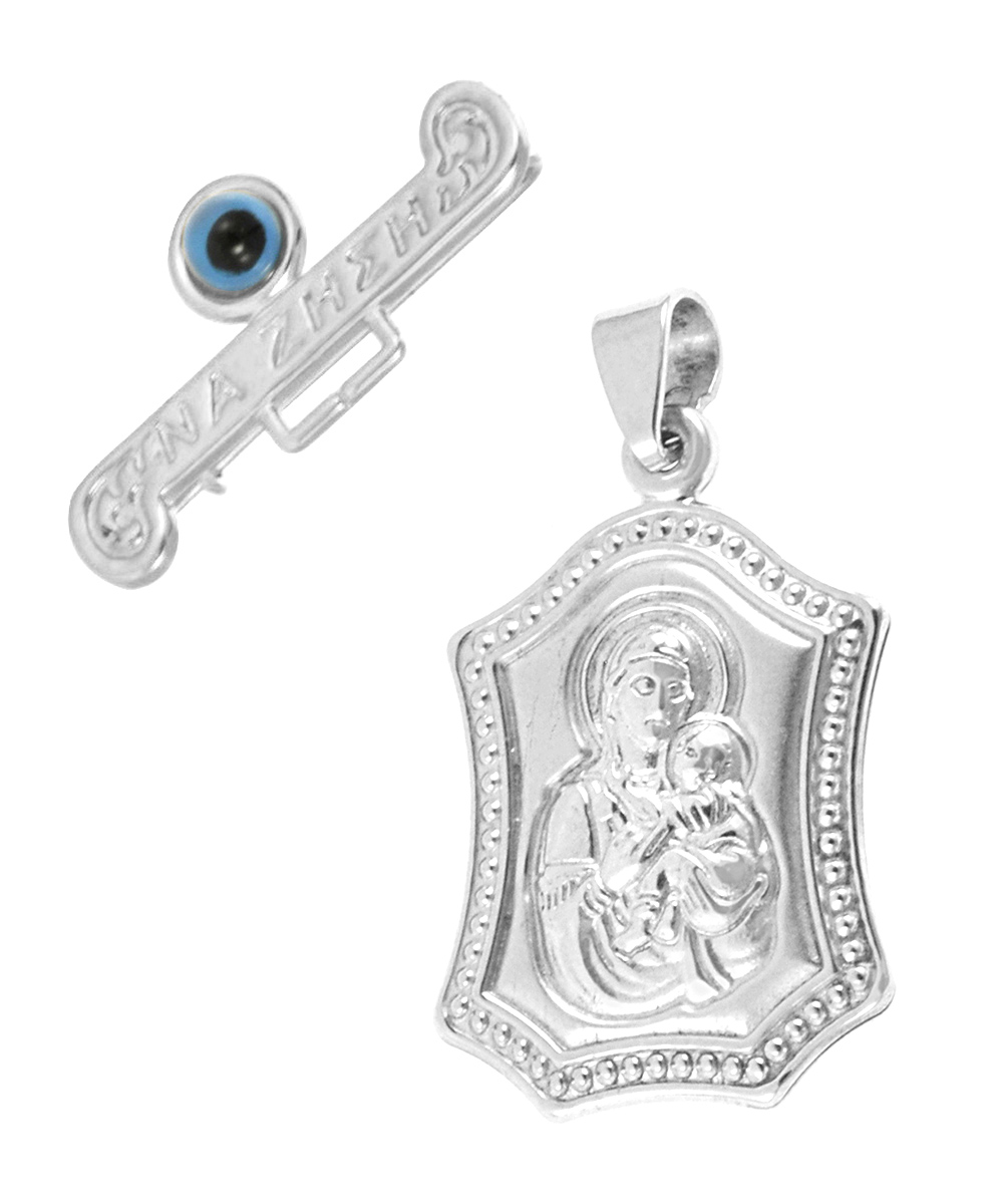 Παναγίτσα Λευκόχρυση 9 Καράτια. Το μενταγιόν συνοδεύεται από καρφίτσα Λευκόχρυση 9 Καράτια.
