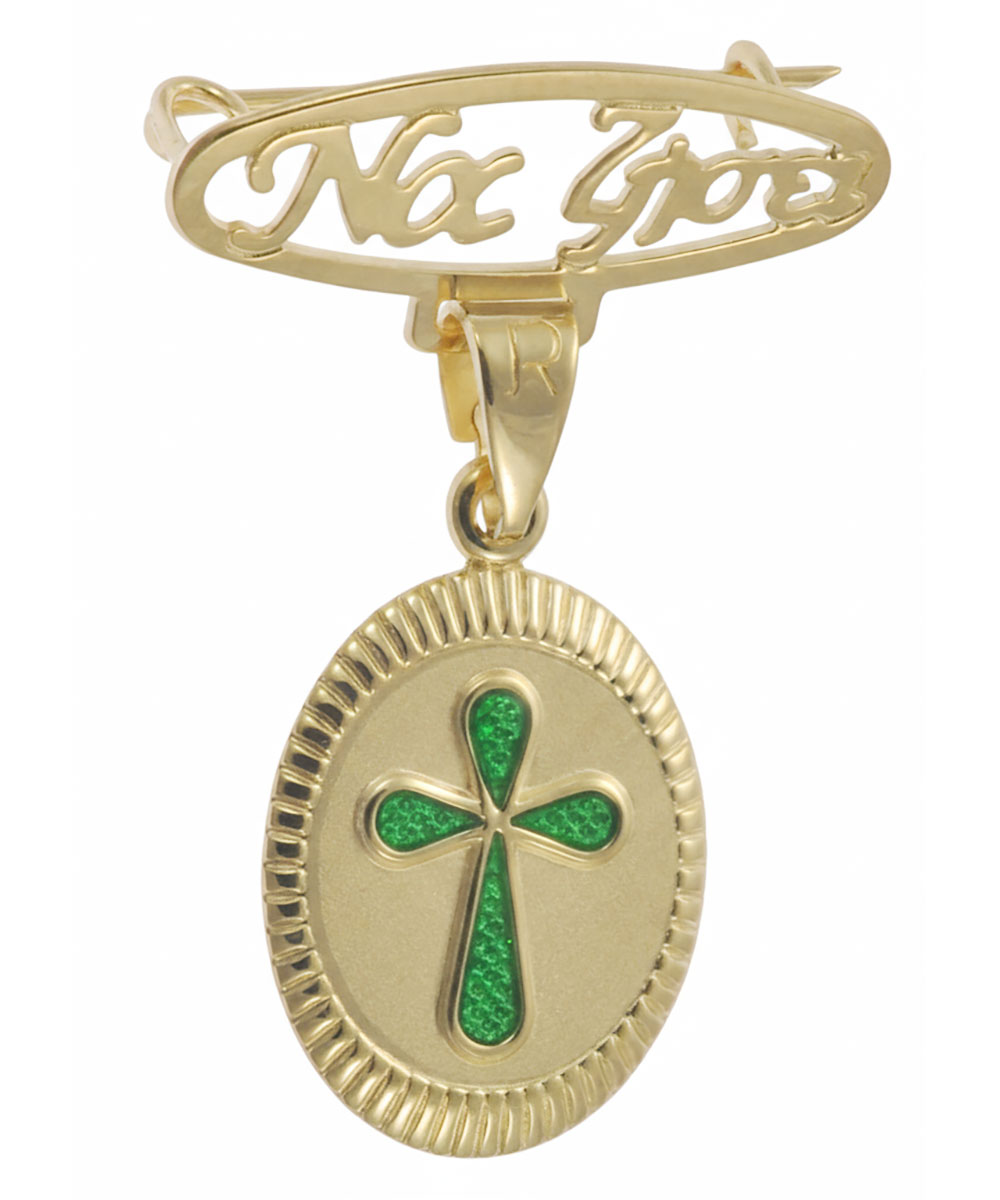 Κομψό χρυσό φυλαχτό 9 καράτια με οβάλ πλαίσιο και σταυρό διακοσμημένο με πράσινο σμάλτο. Η διάτρητη παραμάνα «Να Ζήσει» χαρίζει μοντέρνα αισθητική στο παραδοσιακό φυλαχτό.