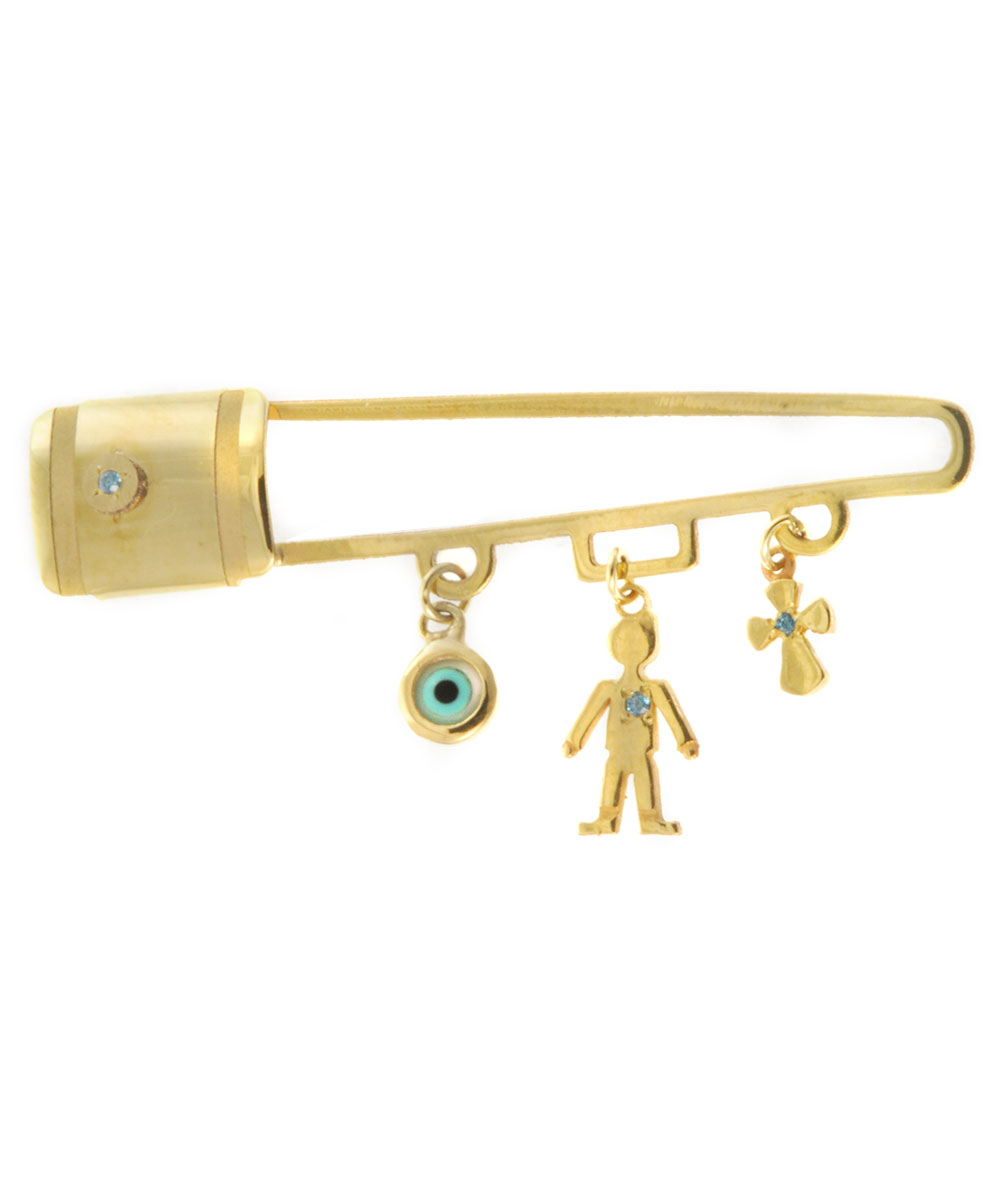 Παιδική παραμάνα χρυσή 9 καράτια με κρεμαστά μοτίφ και με χρωματιστές πέτρες.